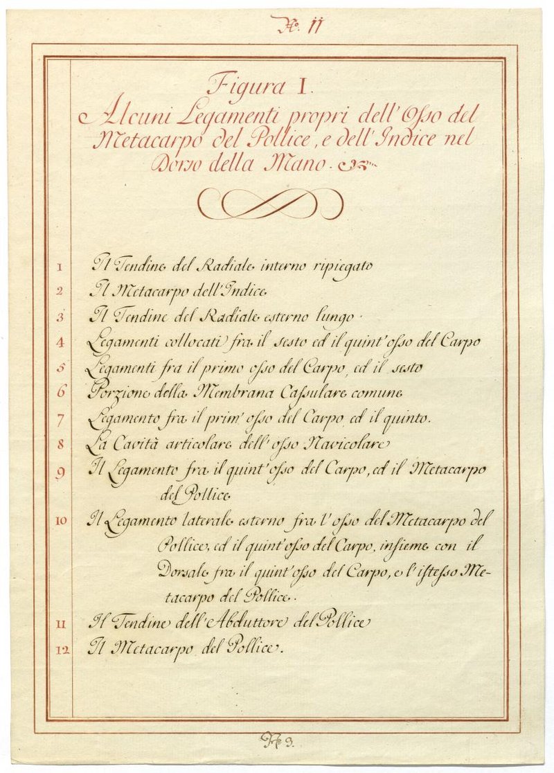 Der Text ist die ergänzende Beschreibung in italienischer Sprache zum anatomischen Wachsmodell der Hand.