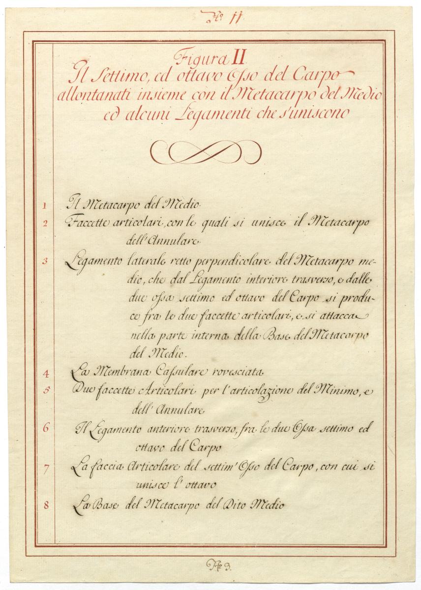 Der Text ist die ergänzende Beschreibung in italienischer Sprache zum anatomischen Wachsmodell der Hand.