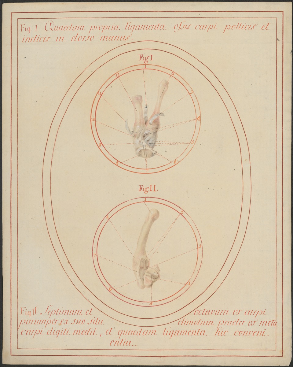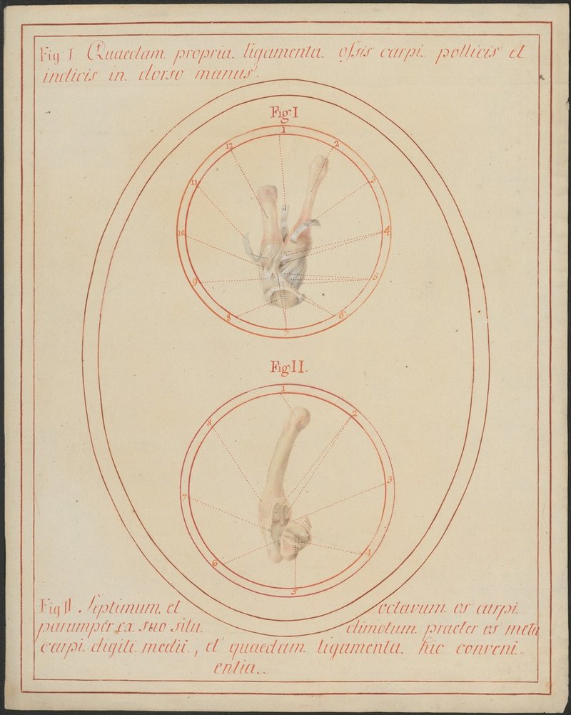 Fig. 1: 11/2: Die Bänder der Daumen- und Zeigefingergrundgelenke auf der Handrückenseite. Die Sehnen der dortigen Musculi interossei sind noch als Stümpfe sichtbar. Fig. 2: 11/5: Die Bänder zwischen dem Mittelhandknochen des Mittelfingers, dem Os capitatum und dem Os hamatum.