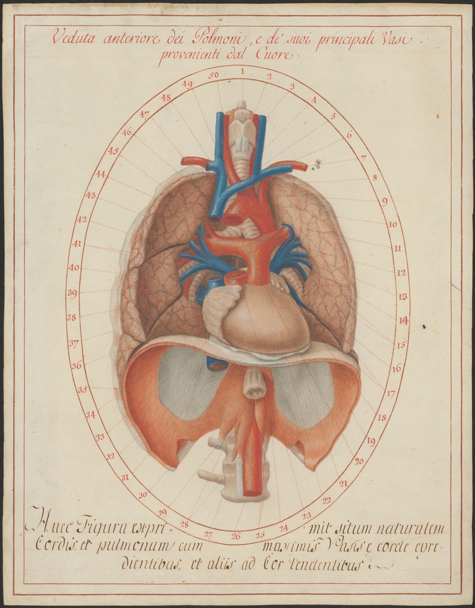 Überblick über das Herz mit den Gefäßen des Lungenkreislaufes. Der Herzbeutel ist entfernt, die Hauptschlagader (Aorta) an ihrer Wurzel beim Herzen durchtrennt und auch die obere Hohlvene ist bei ihrem Eintritt in das Herz durchtrennt. Hierdurch kommen der Truncus pulmonalis in rot und die Lungenvenen (Venae pulmonales) in Blau bis zu den Lungenflügeln zur Ansicht. Ebenfalls sichtbar ist ein entwicklungsgeschichtlicher Rest des fetalen Kreislaufes, das Ligamentum arteriosum als Verbindung zwischen Truncus pulmonalis und Hauptschlagader.
