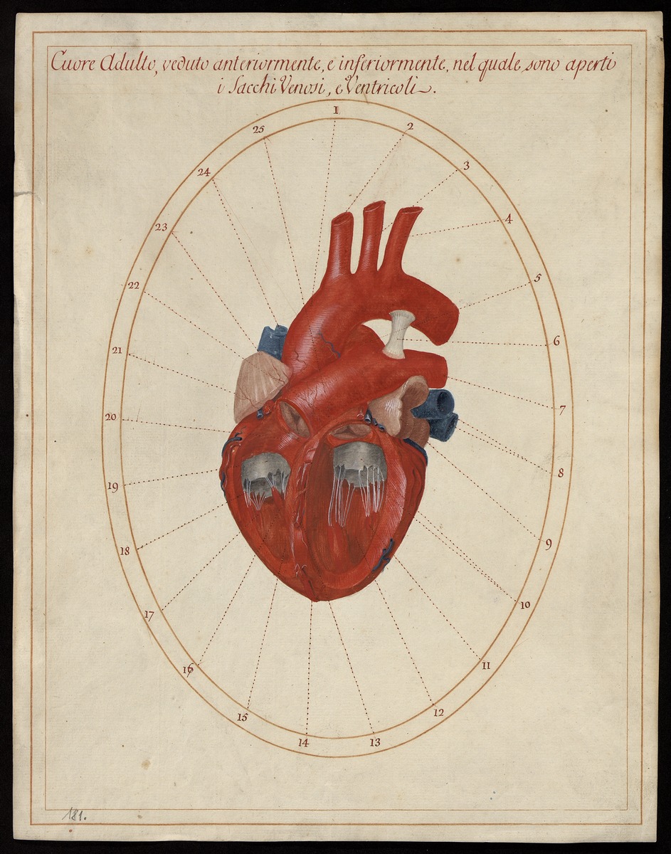 Das Herz eines Erwachsenen von vorne: der rechte Vorhof und beide Kammern (Atrium dextrum et ventriculi cordis) sind eröffnet, zwischen den Kammern ist ein Muskelsteg mit den dort verlaufenden Ästen der Herzkranzgefäße erhalten, um die Position der Kammerscheidewand zu verdeutlichen. Außen sieht man die beiden Herzohren (Auriculae cordis), die obere Hohlvene (Vena cava superior), die Hauptschlagader (Aorta), die Lungenschlagader (Truncus pulmonalis), zwischen ihnen das Ligamentum arteriosum [Botalli] und die Lungenvenen (Venae pulmonales). Innen sieht man die Segelklappen zwischen den Vorhöfen und den Kammern – rechts die Trikuspidalklappe (Valva atrioventricularis dextra [Valva tricuspidalis]) und links die Mitralklappe (Valva atrioventricularis sinistra [Valva mitralis s. bicuspidalis]) – sowie die Klappen zwischen den Kammern und den abführenden großen Gefäßen – rechts die Klappe der Lungenschlagader (Valva pulmonalis) und rechts die der Klappe der Hauptschlagader (Valva aortae).