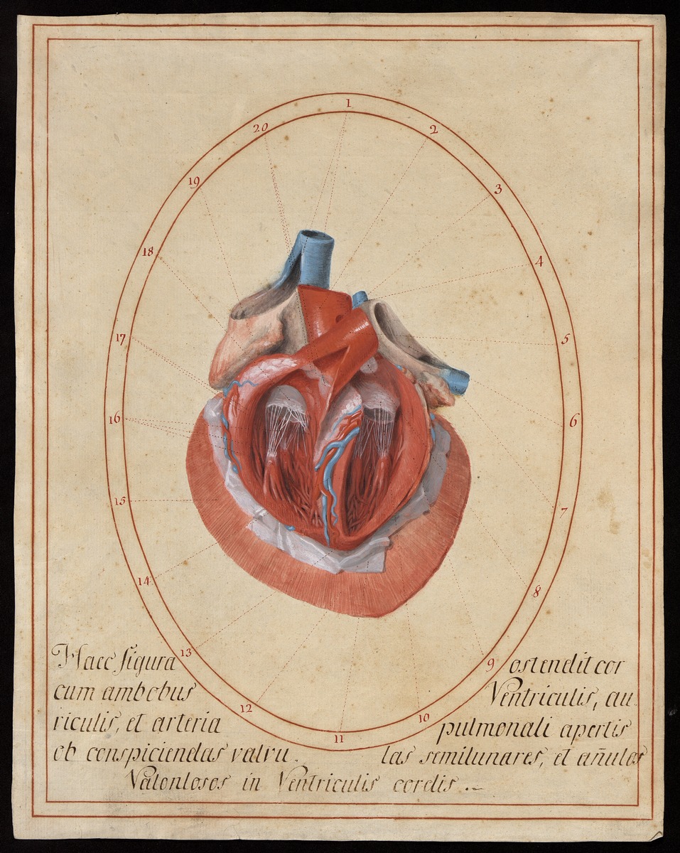 Das Herz mit den eröffneten Vorhöfen (Atria) und Kammern (Ventriculi), im aufgeschnittenen und zurückgeschlagenen Herzbeutel (Pericardium), ein Teil des Zwerchfells (Diaphragma) ist ebenfalls dargestellt. Zwischen den Kammern ist ein Muskelsteg mit den dort verlaufenden Ästen der Herzkranzgefäße erhalten, um die Position der Kammerscheidewand zu verdeutlichen.