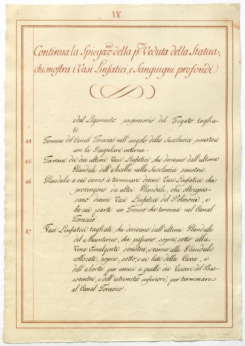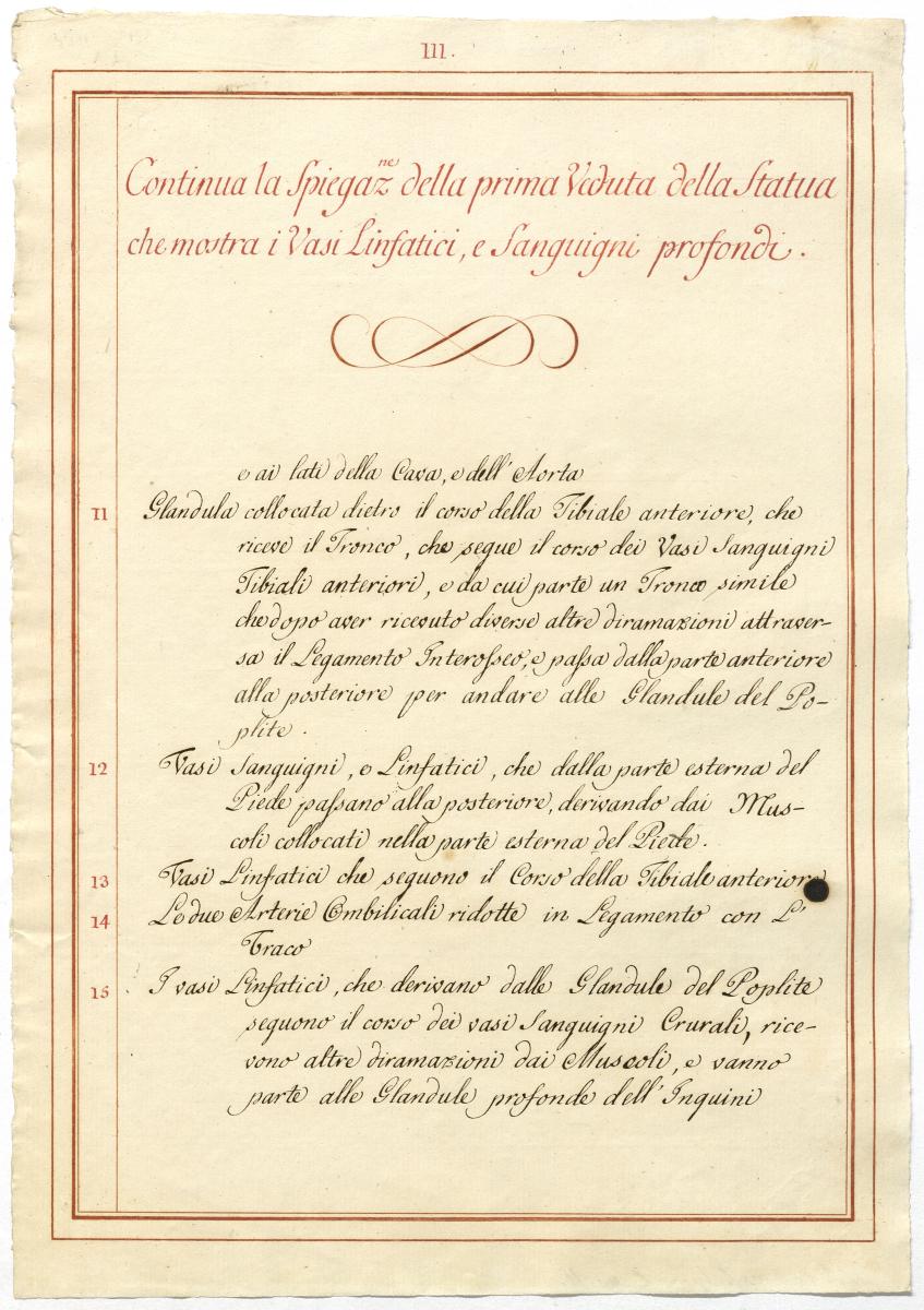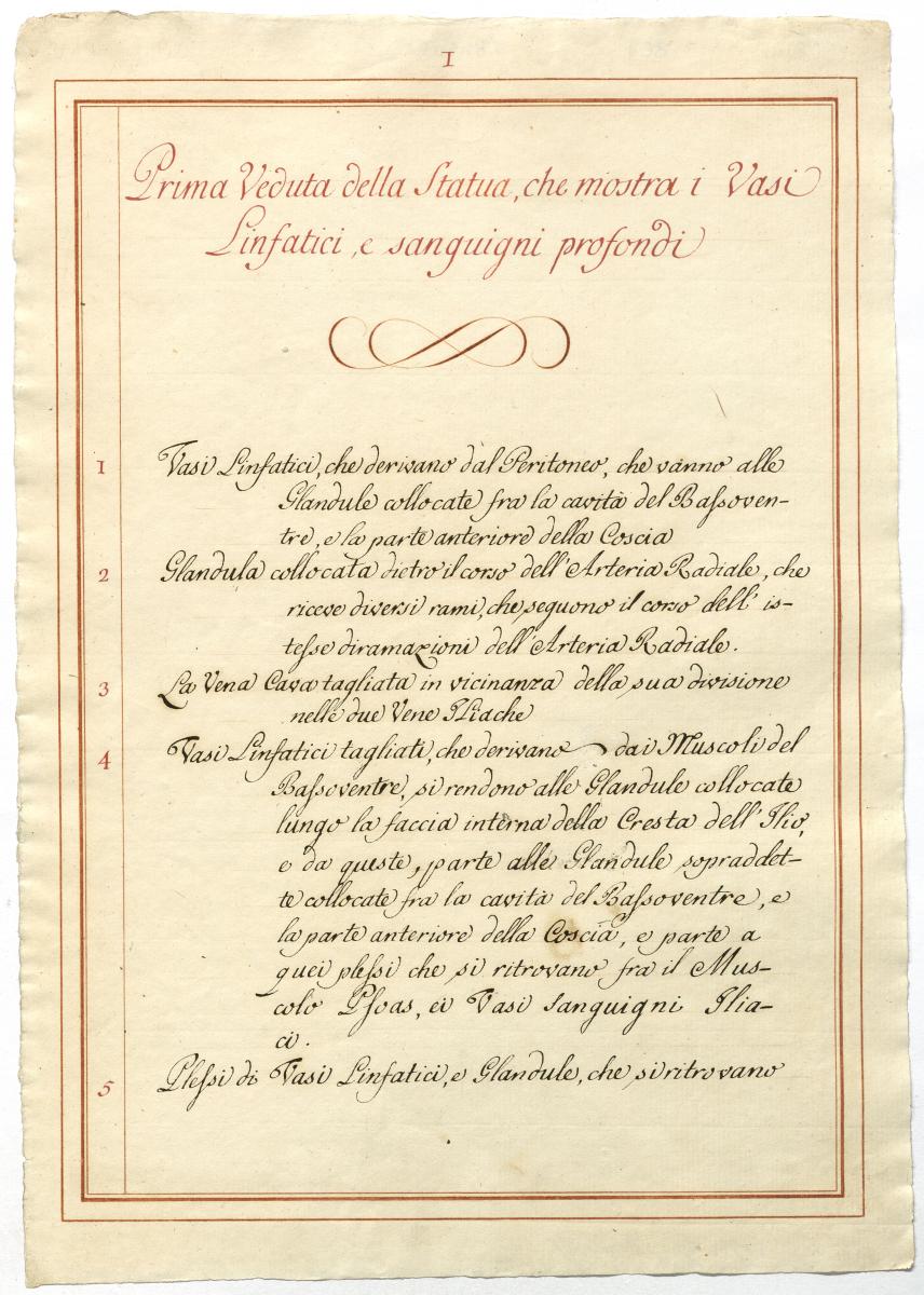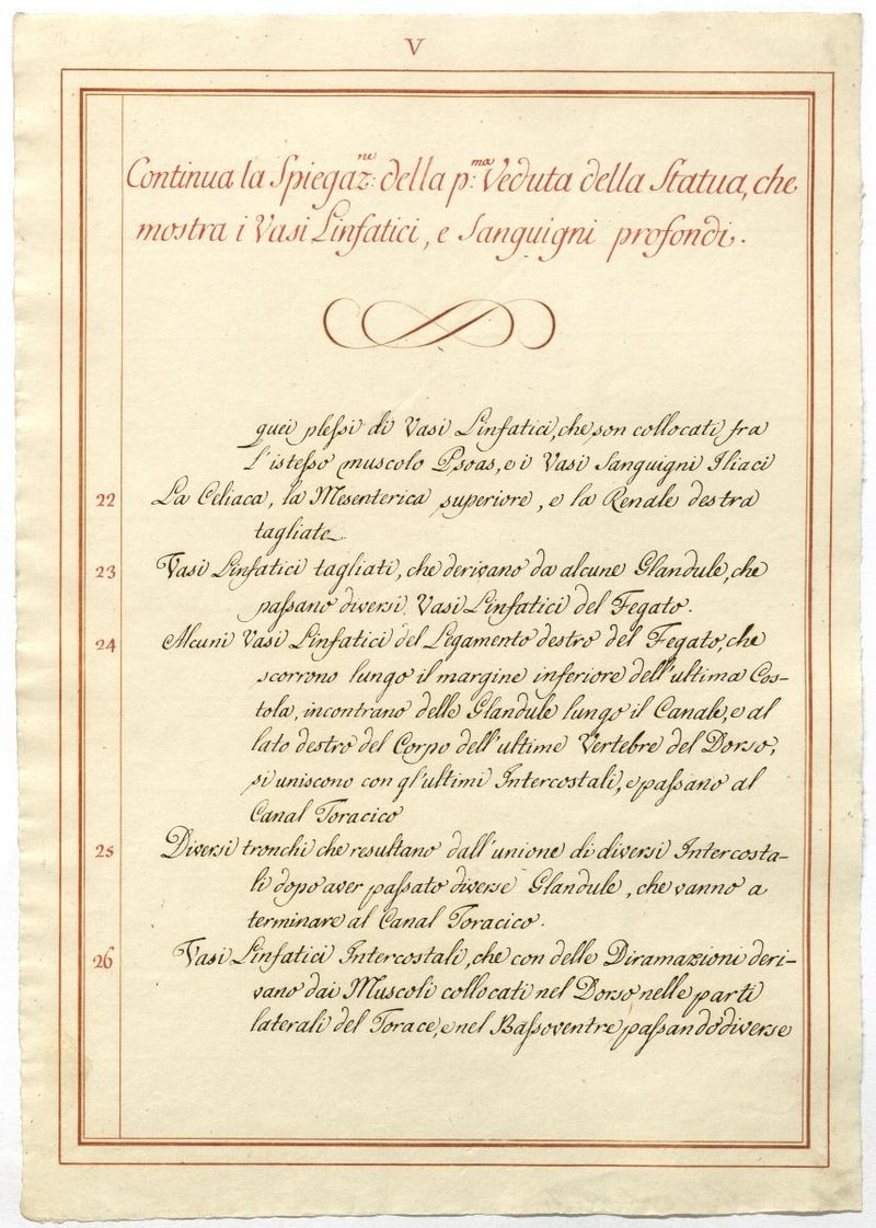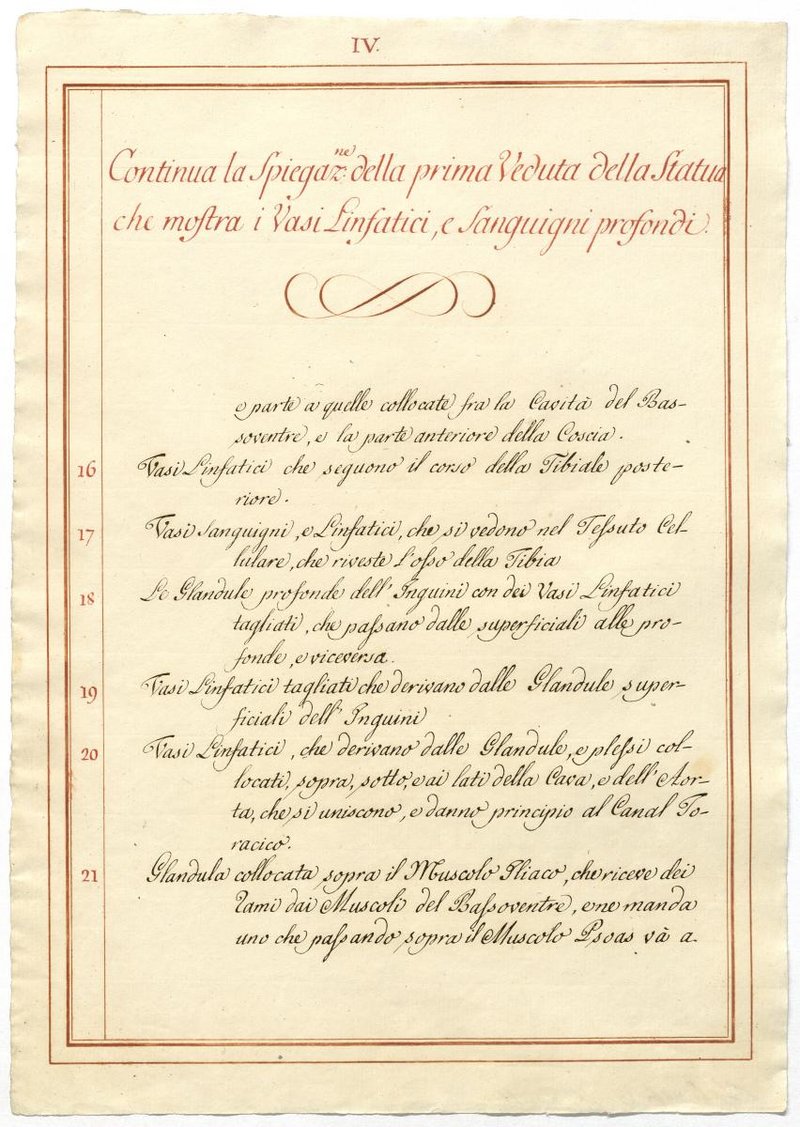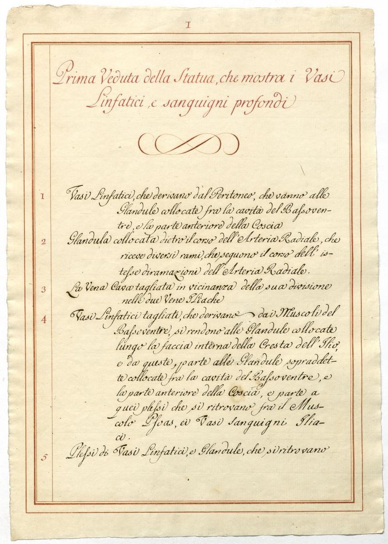 Der Text ist die ergänzende Beschreibung in italienischer Sprache zum anatomischen Wachsmodell der Blut- und Lymphgefäße.