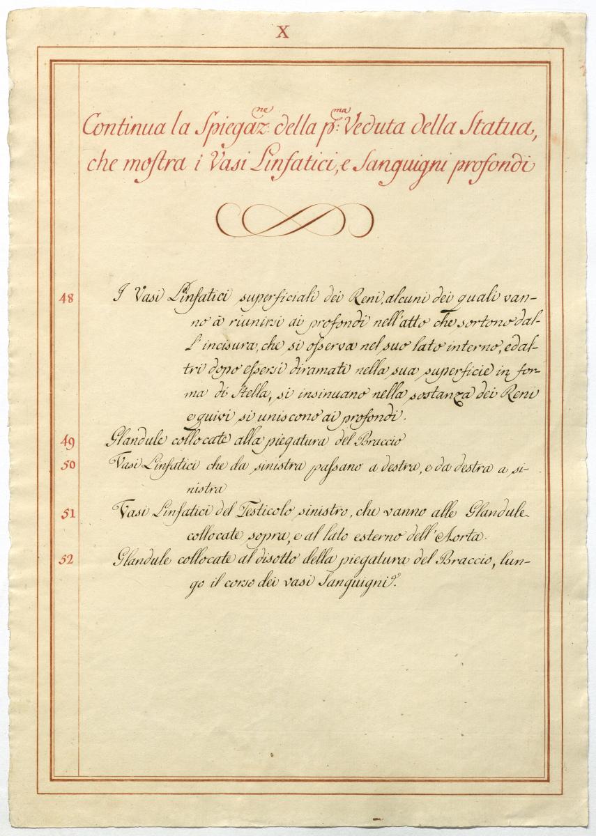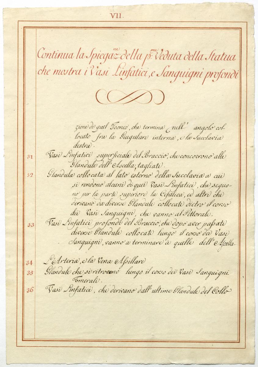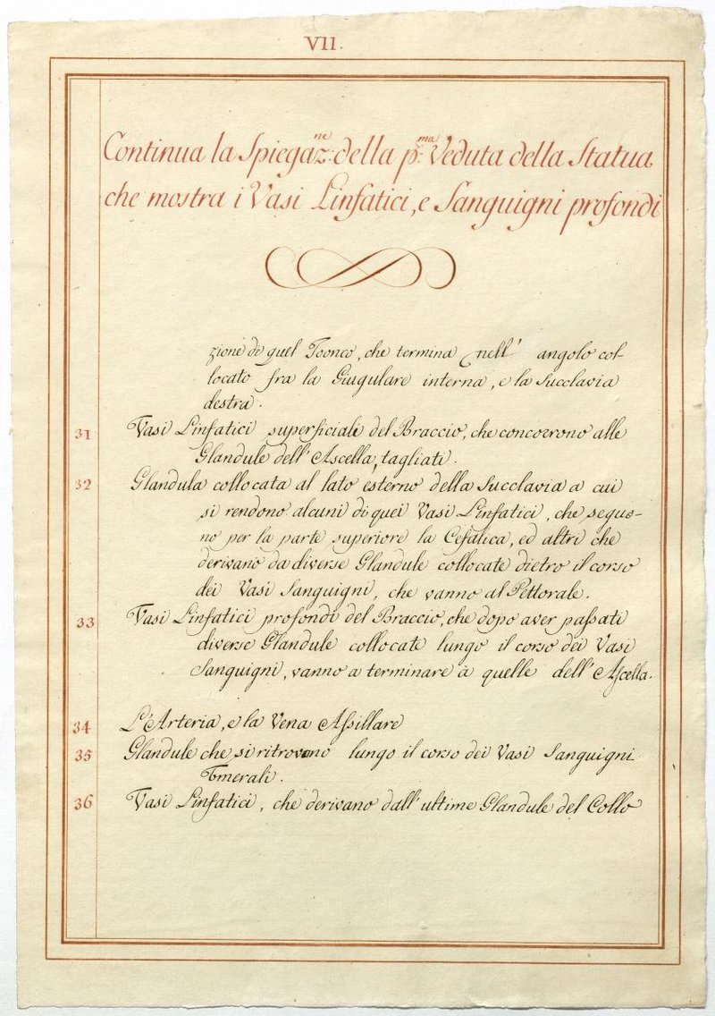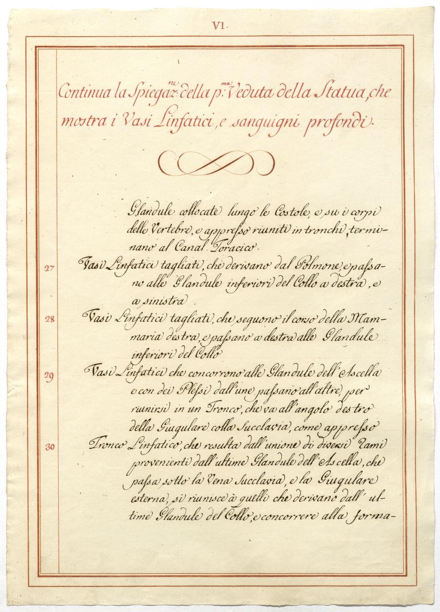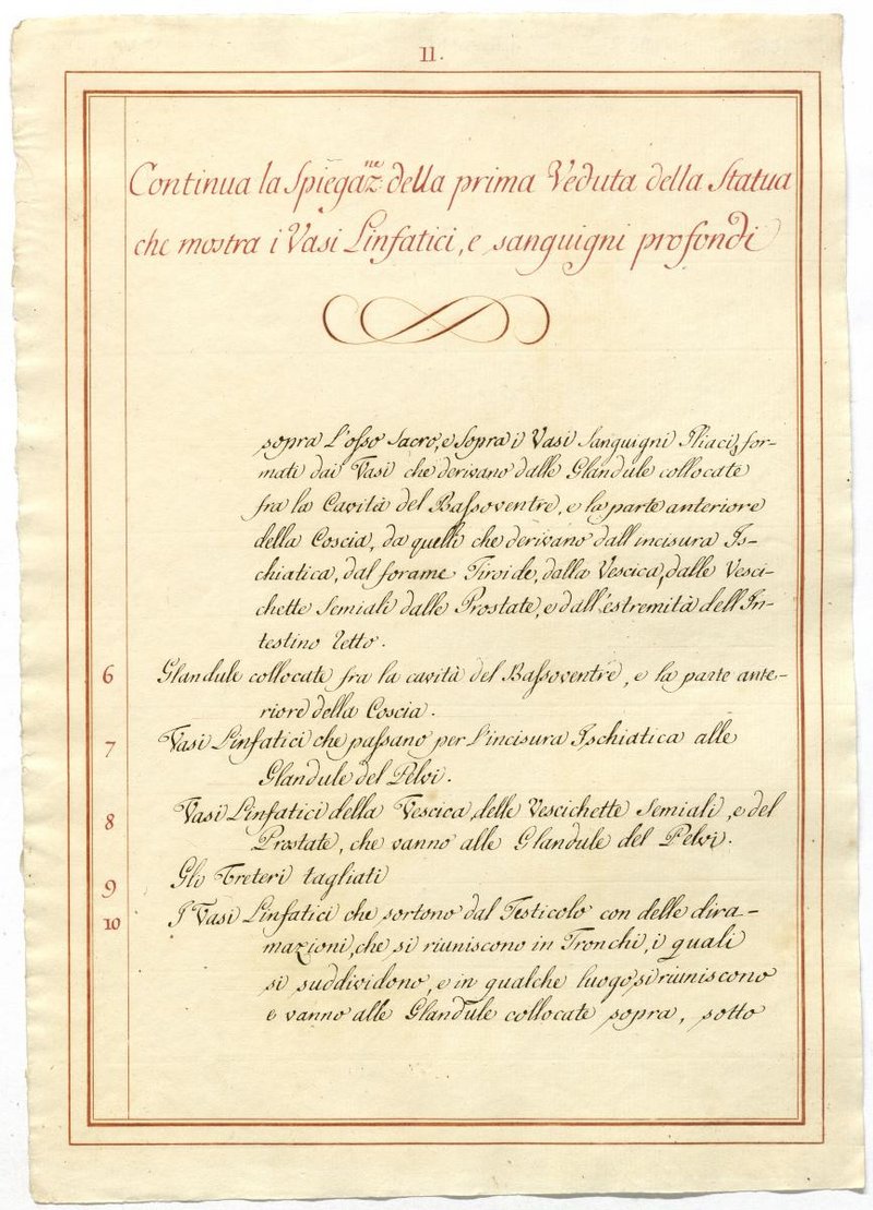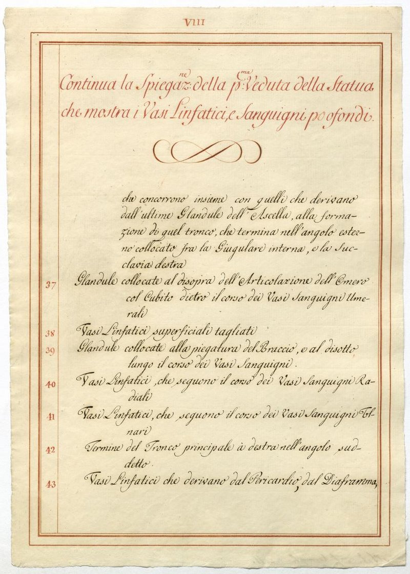 Der Text ist die ergänzende Beschreibung in italienischer Sprache zum anatomischen Wachsmodell der Blut- und Lymphgefäße.
