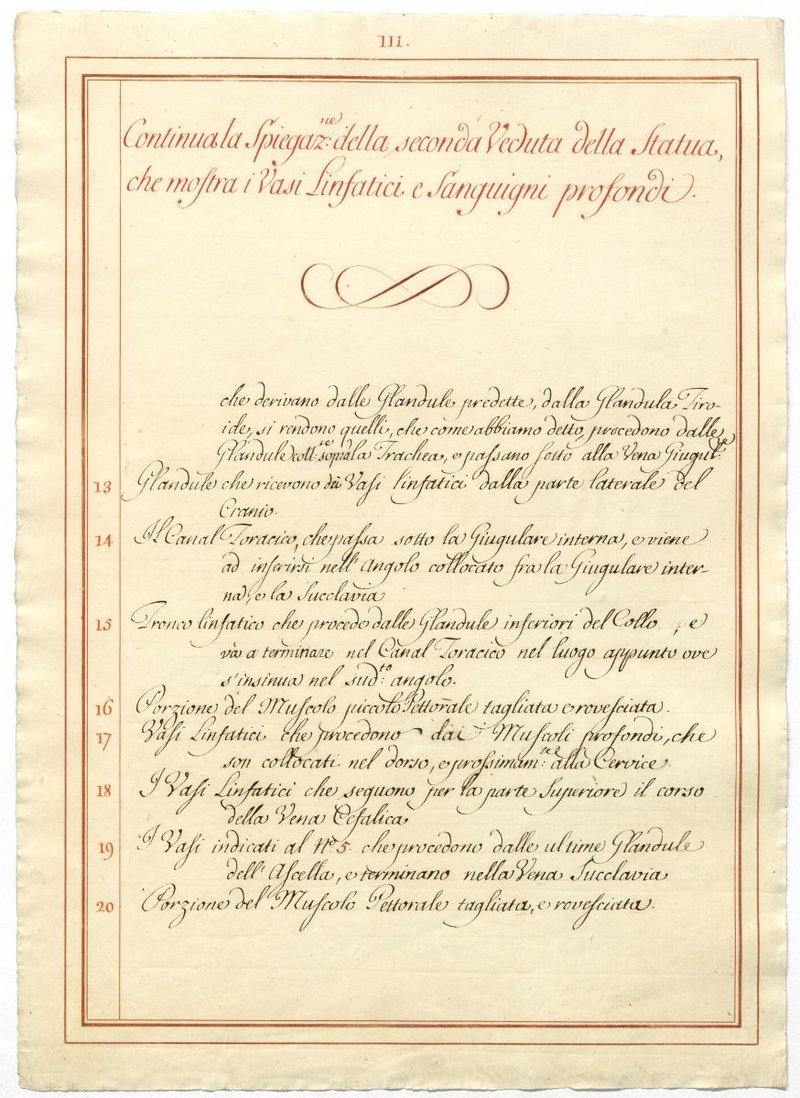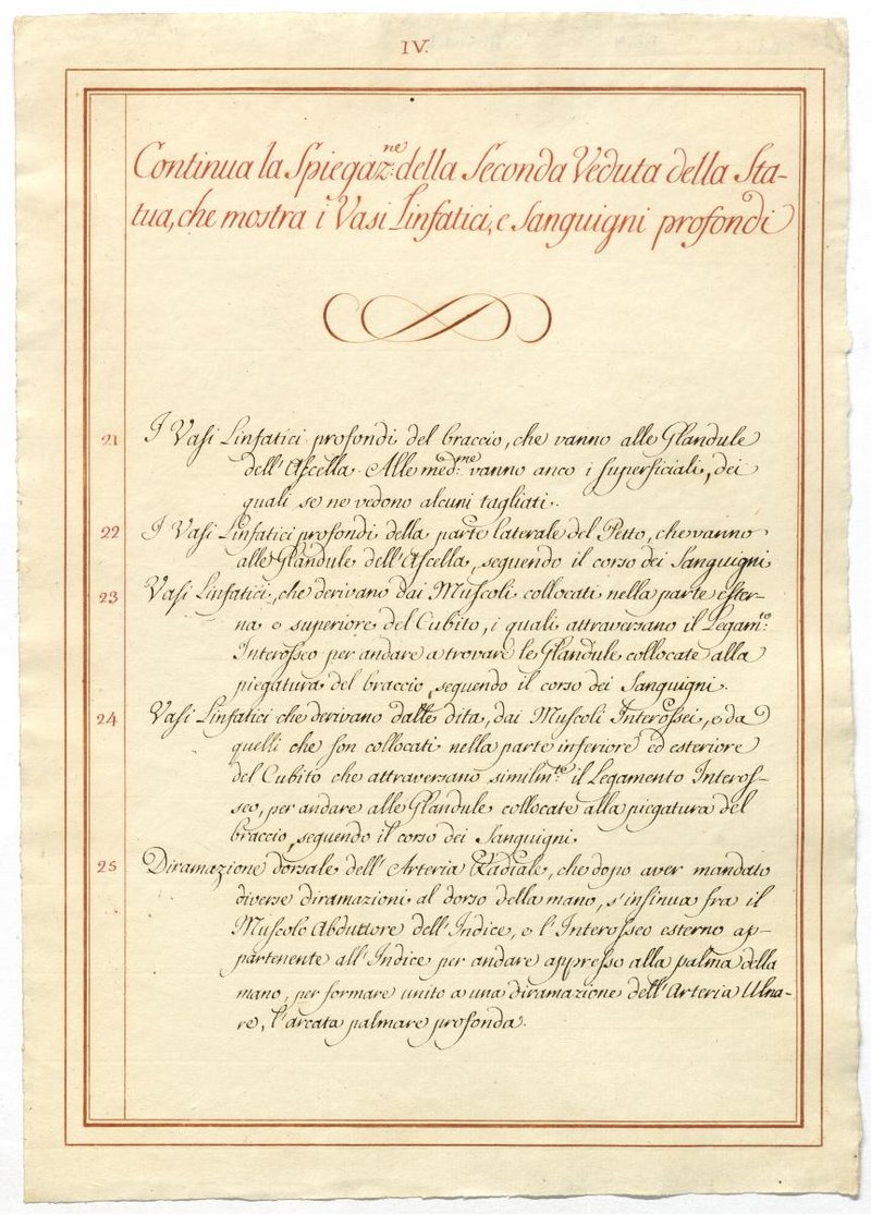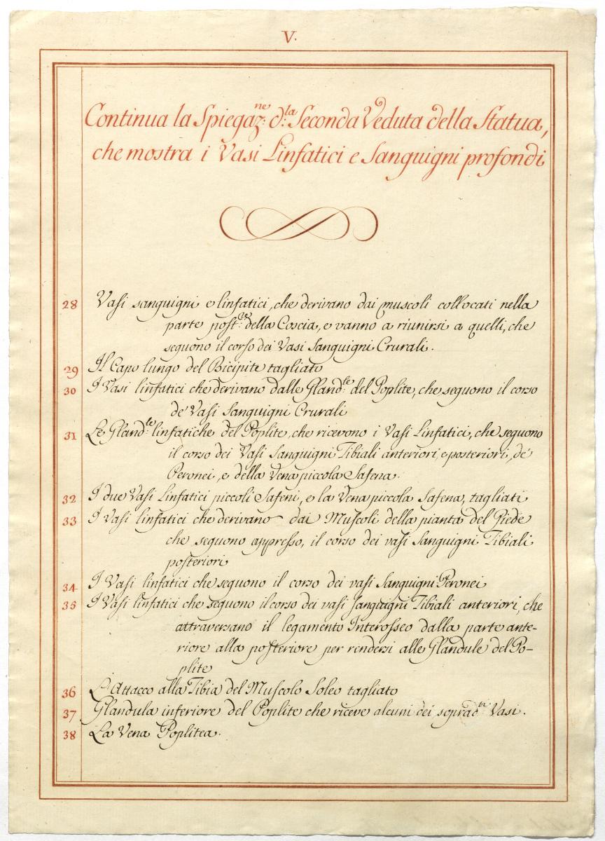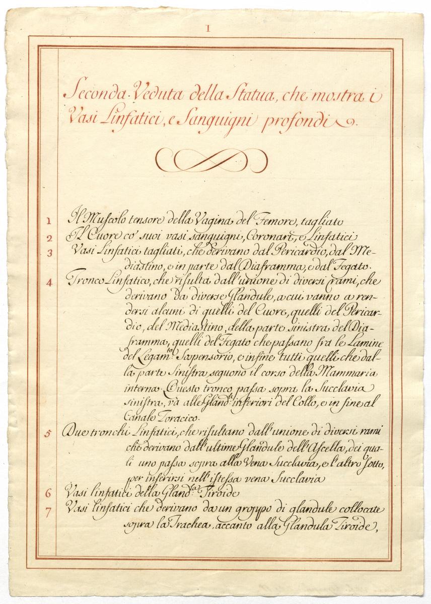 Der Text ist die ergänzende Beschreibung in italienischer Sprache zum anatomischen Wachsmodell der Blut- und Lymphgefäße.