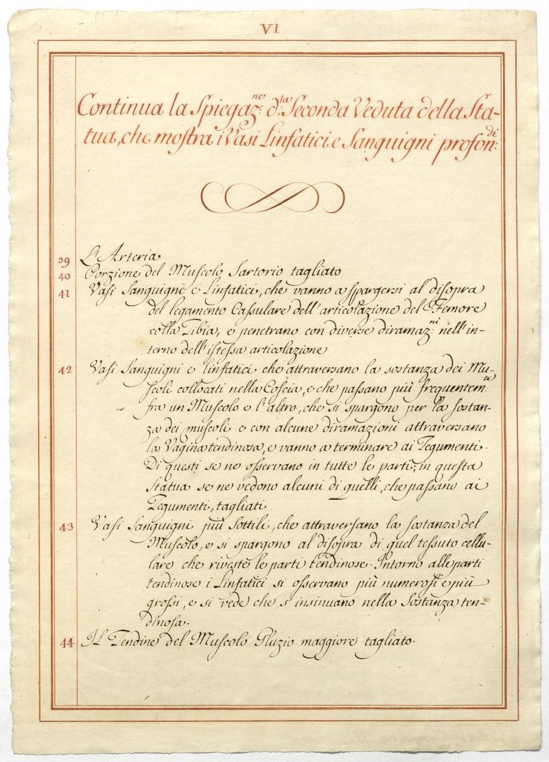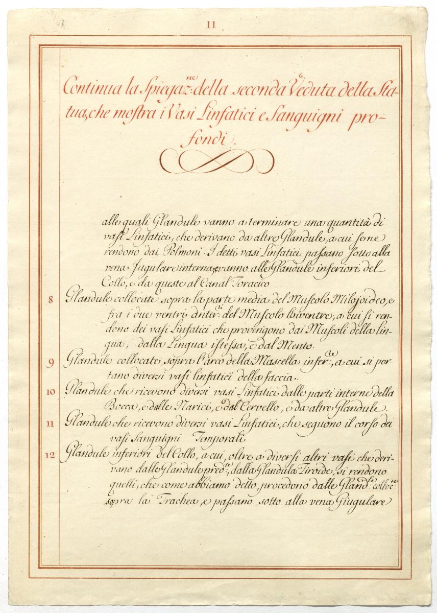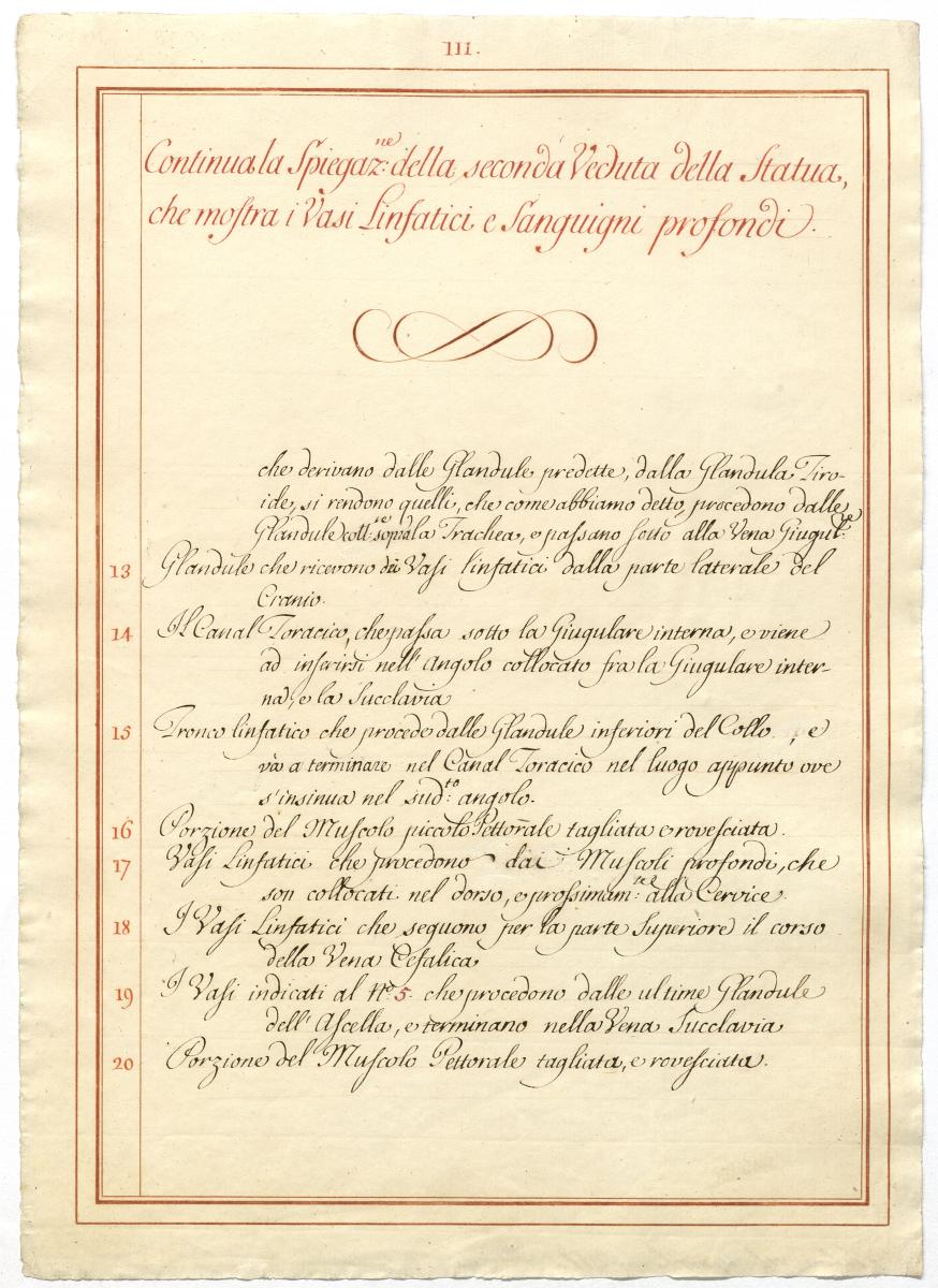 Der Text ist die ergänzende Beschreibung in italienischer Sprache zum anatomischen Wachsmodell der Blut- und Lymphgefäße.