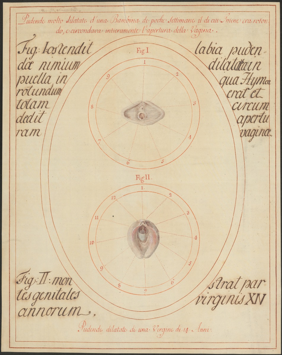 Fig. 1: 239/2: Das Hymen einer Neugeborenen. Fig. 2: 239/3: Die äußeren Geschlechtsteile (Partes genitales externae) eines 14jährigen Mädchens.