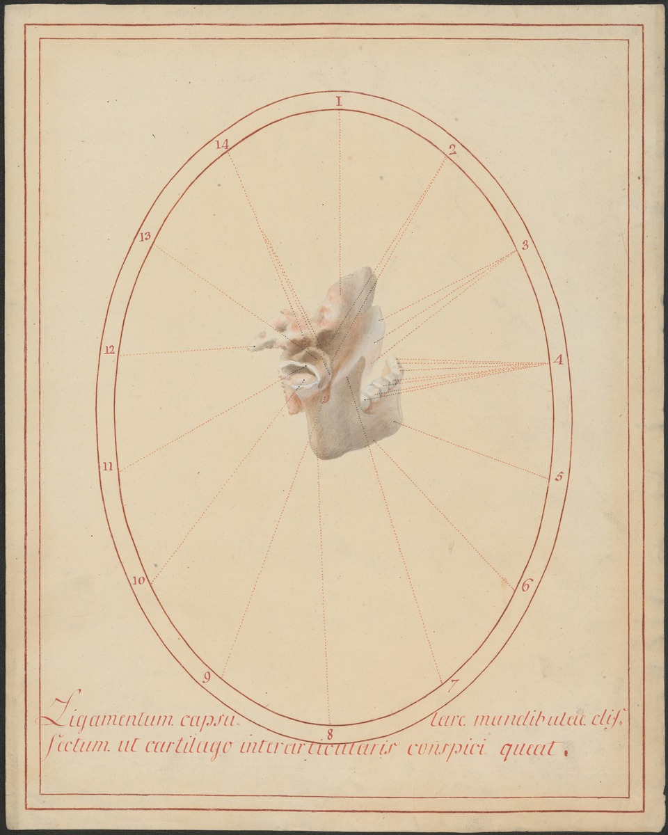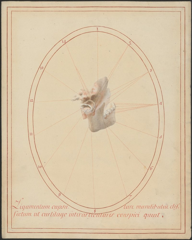 Isoliertes Modell aus einem Teil des Schläfenbeins (Os temporale) und einem Teil des Unterkieferknochens (Mandibula). Das Kiefergelenk (Articulatio temporomandibularis), eröffnet zur Darstellung der Gelenkscheibe (Discus articularis) in einer maximalen künstlichen Adduktionsstellung.