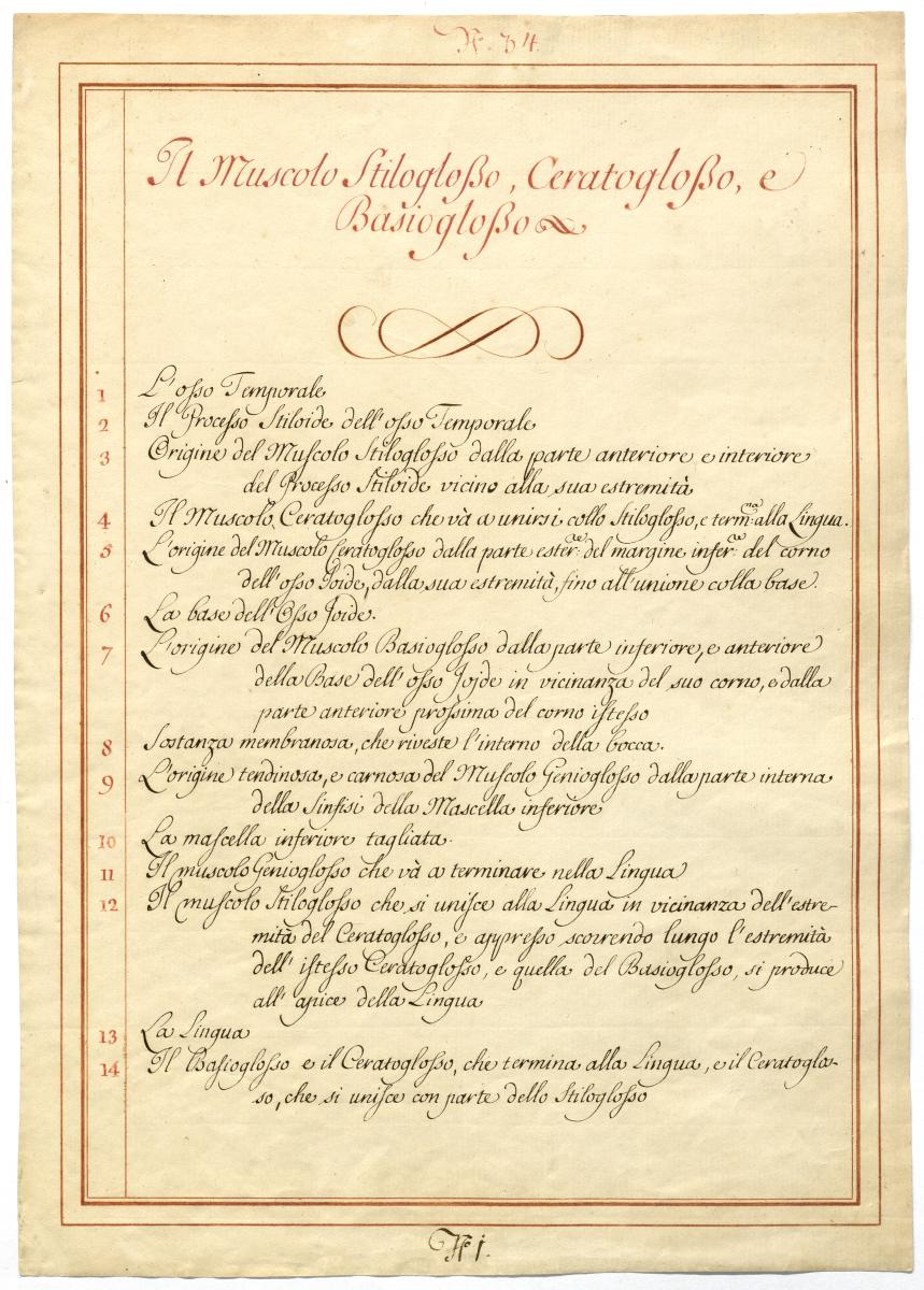 Der Text ist die ergänzende Beschreibung in italienischer Sprache zum anatomischen Wachsmodell der äußeren Zungenmuskulatur.