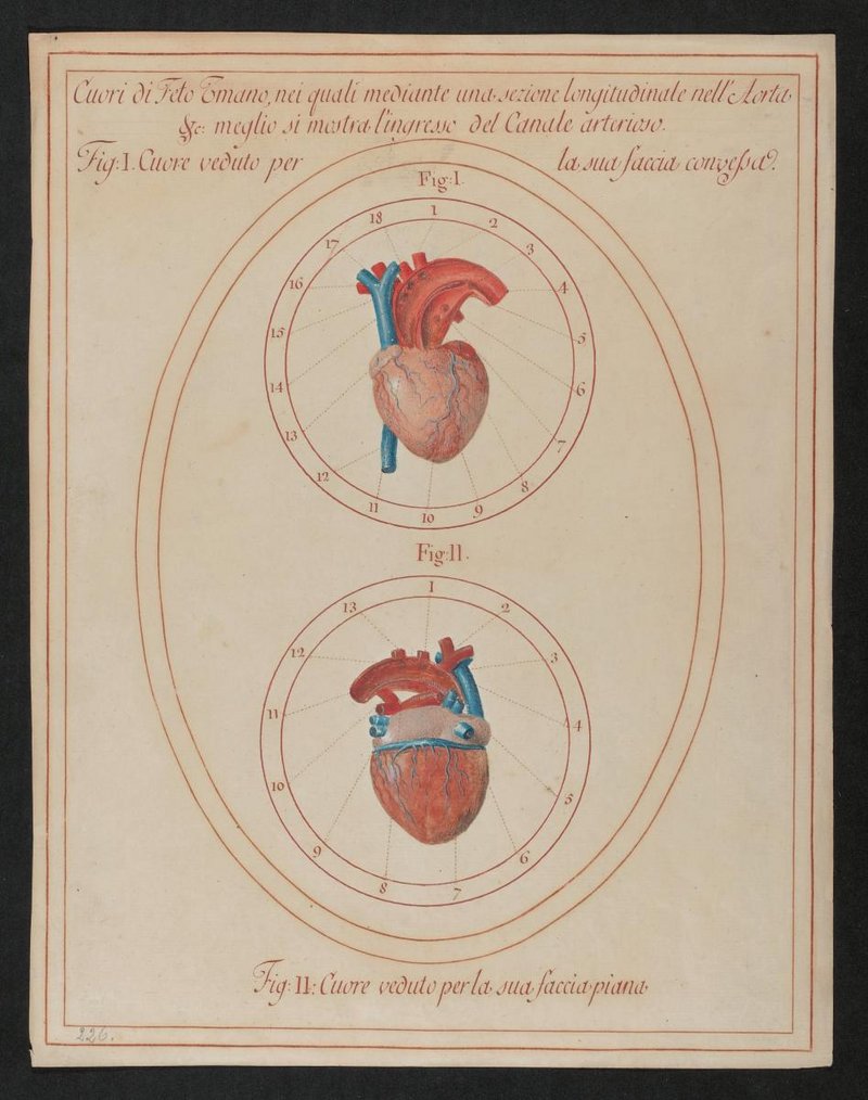 Fig. 1: 140/4: Das vergrößerte Herz eines menschlichen Fötus mit dem eröffneten Bogen der Hauptschlagader (Arcus aortae) und deren Verbindung (Ductus arteriosus [Botalli]) zur Lungenschlagader (Truncus pulmonalis), von vorne. Fig. 2: 140/6: Das vergrößerte Herz eines menschlichen Fötus mit dem eröffneten Bogen der Hauptschlagader (Arcus aortae) und deren Verbindung (Ductus arteriosus [Botalli]) zur Lungenschlagader (Truncus pulmonalis), von hinten.
