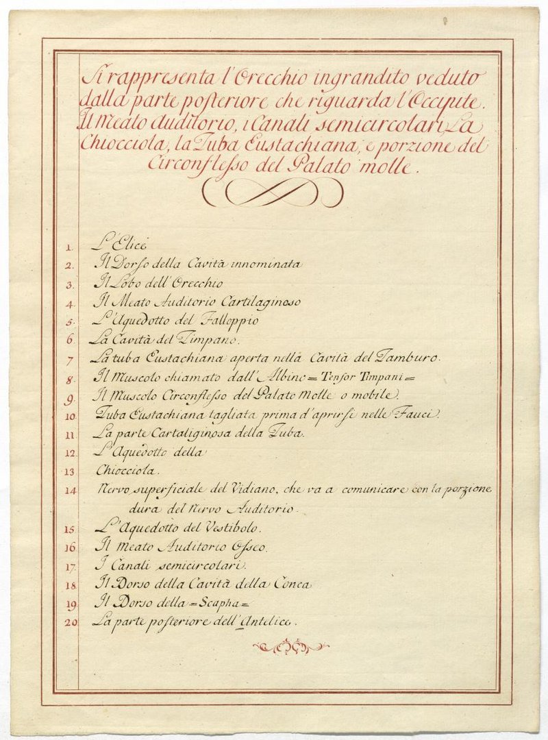 Der Text ist die ergänzende Beschreibung in italienischer Sprache zum anatomischen Wachsmodell des Ohres.