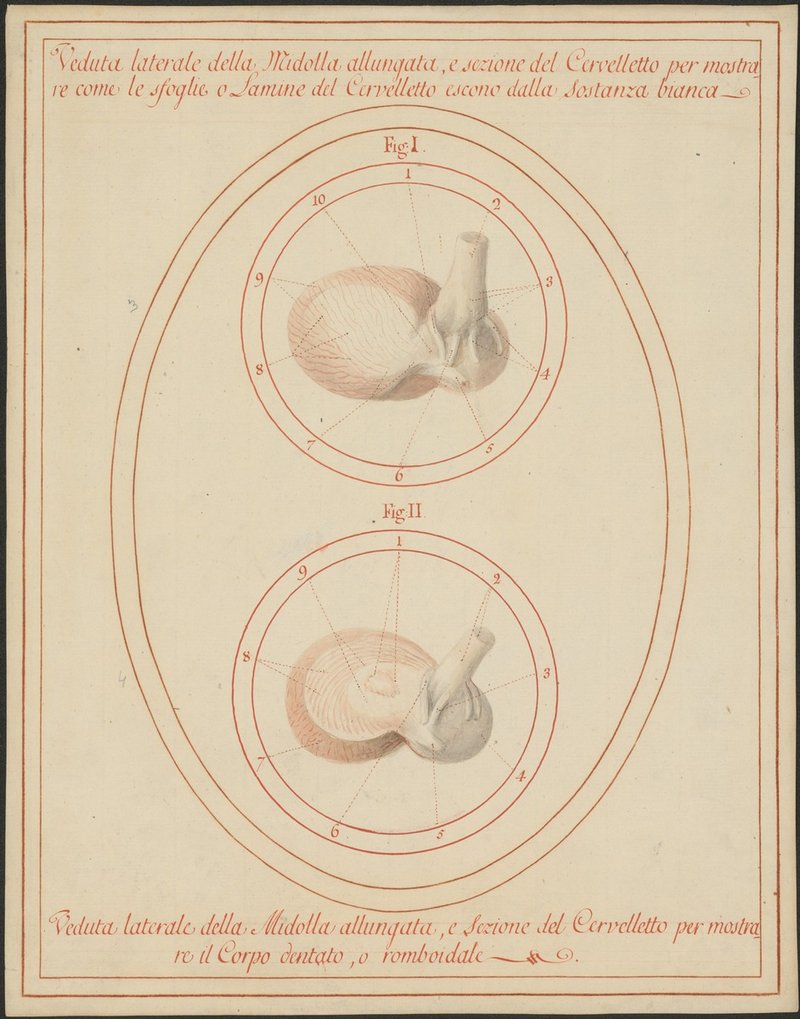 Fig. 1: 261/3: Das verlängerte Mark (Medulla oblongata), die Brücke (Pons) und das Kleinhirn (Cerebellum) mit verschiedenen Hirnnerven. Fig. 2: 261/4: Das verlängerte Mark (Medulla oblongata), die Brücke (Pons) und die linke Hälfte des Kleinhirns (Cerebellum). Von dieser wurde zur Darstellung des Nucleus dentatus ein Stück abgetragen.