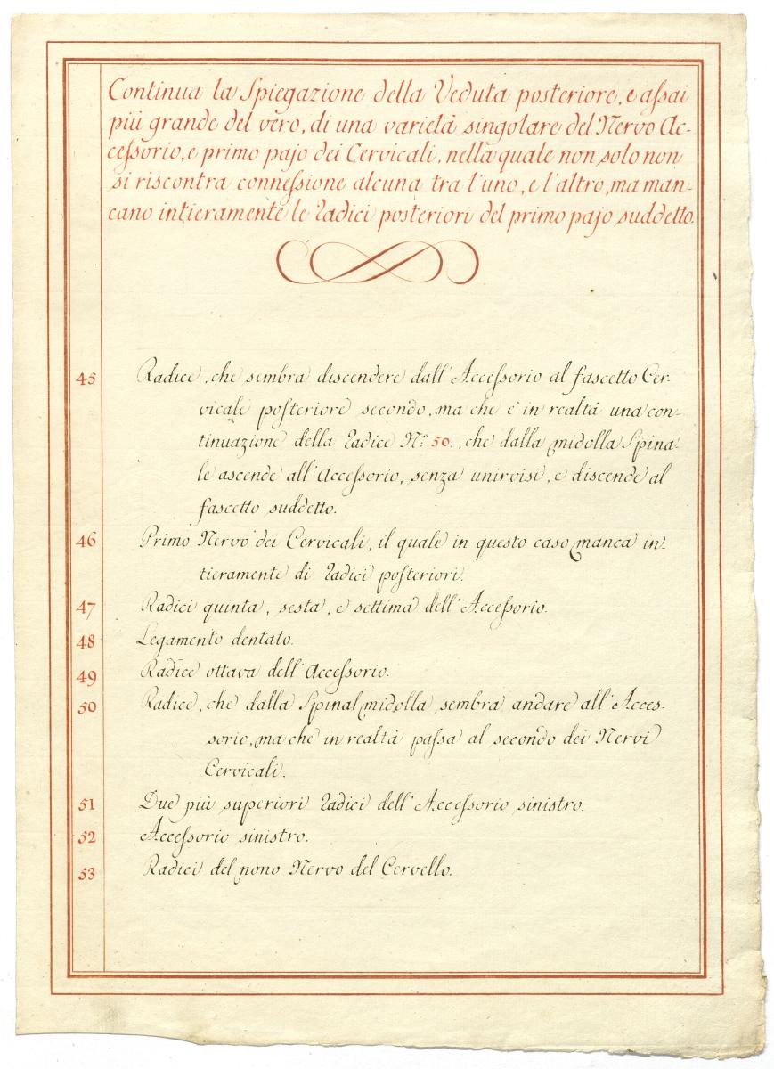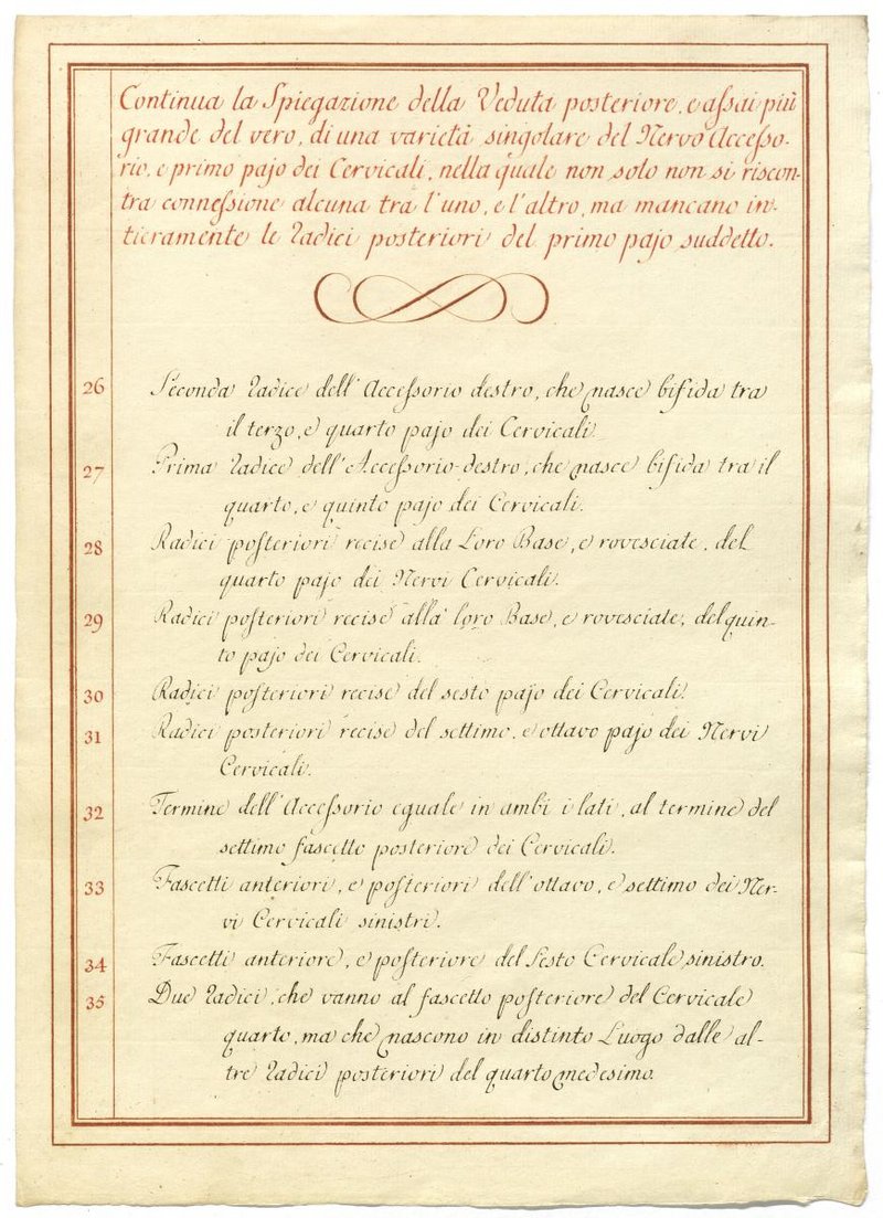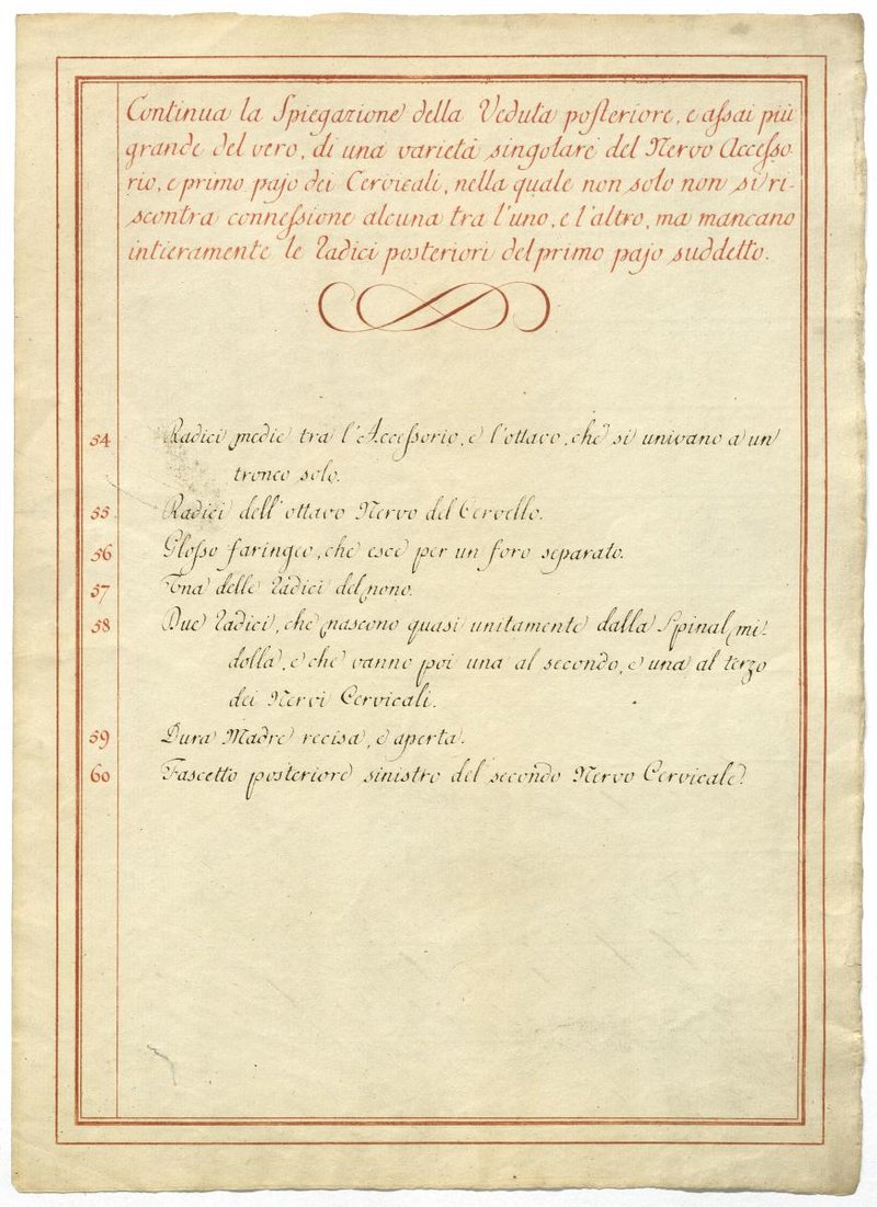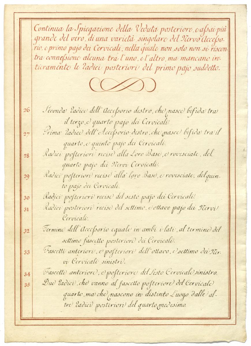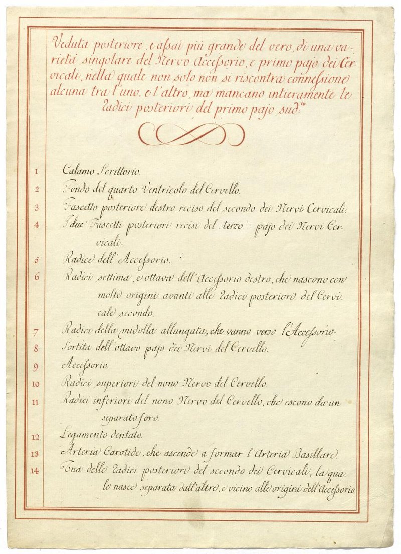 Der Text ist die ergänzende Beschreibung in italienischer Sprache zum anatomischen Wachsmodell des Nervus accessorius.