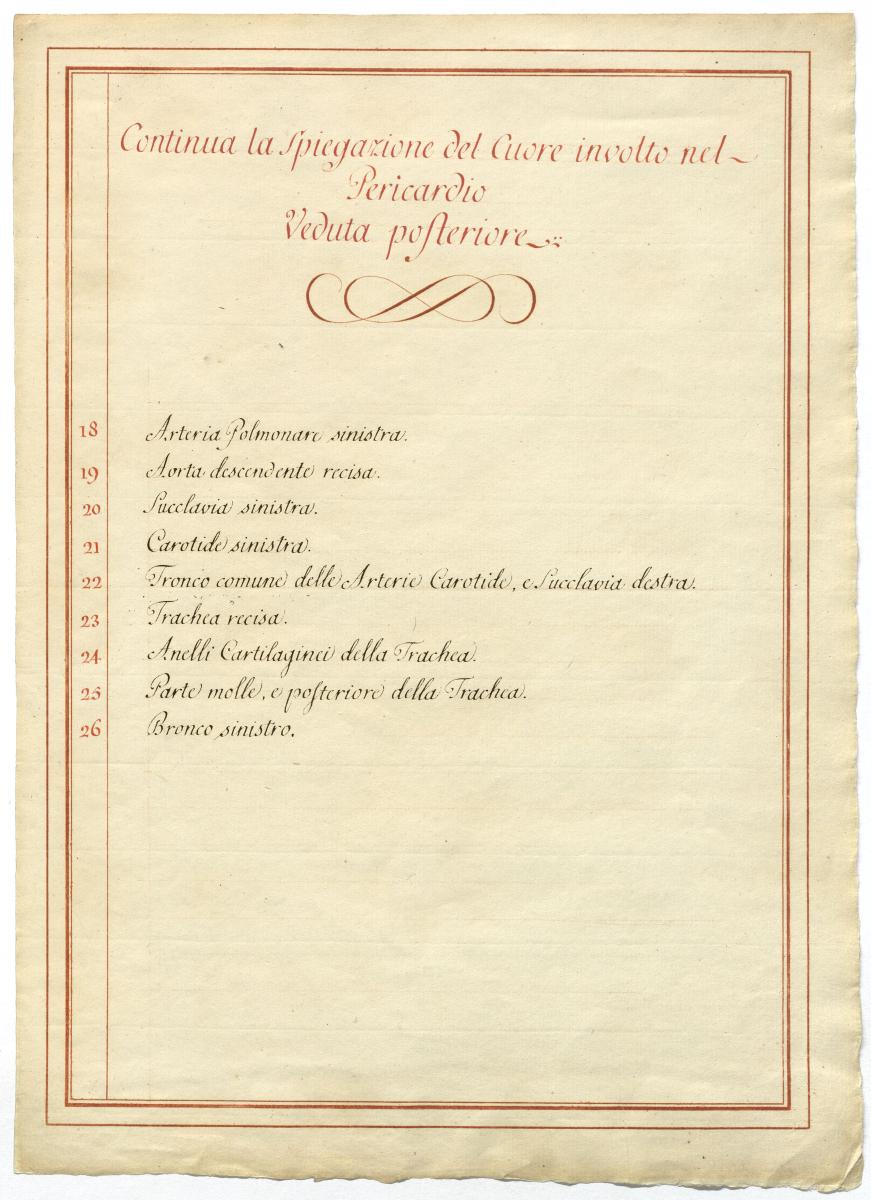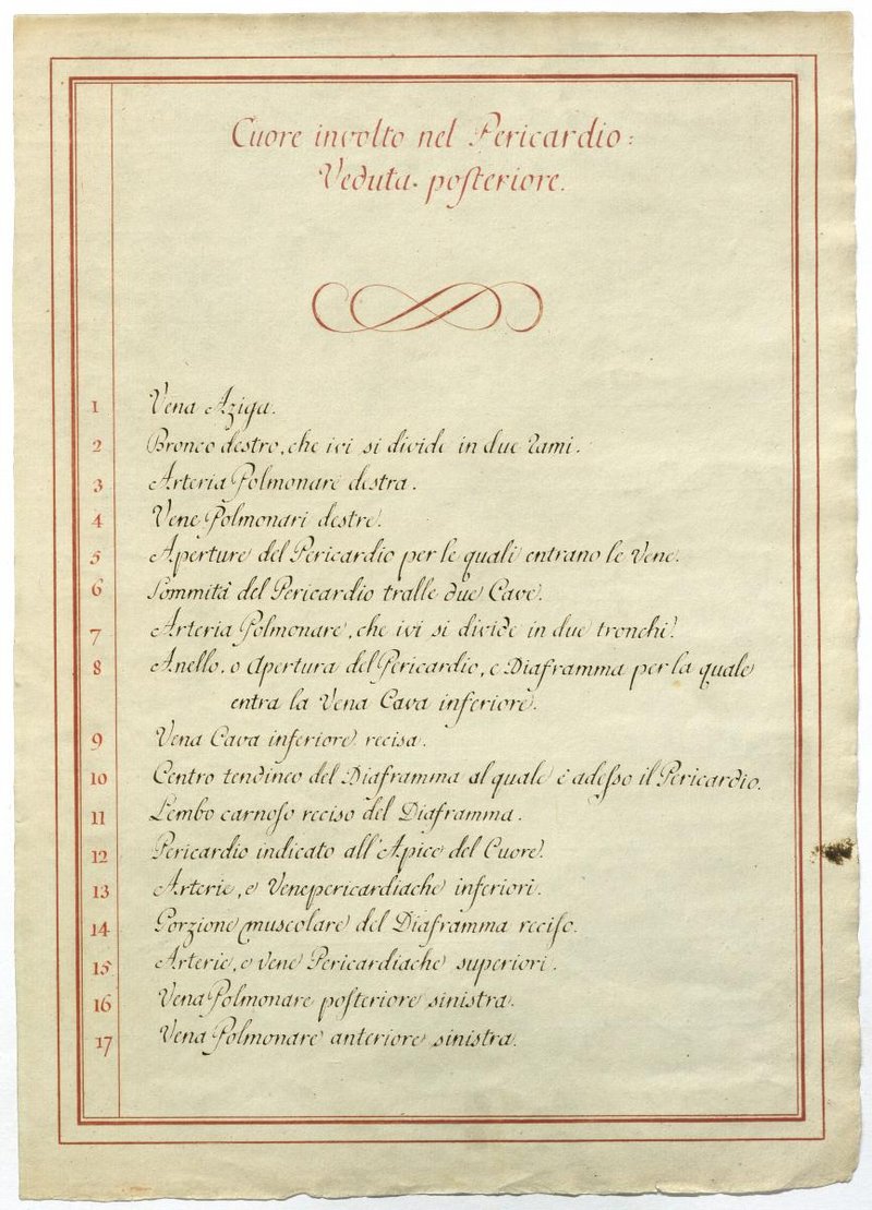 Der Text ist die ergänzende Beschreibung in italienischer Sprache zum anatomischen Wachsmodell des Herzbeutels.