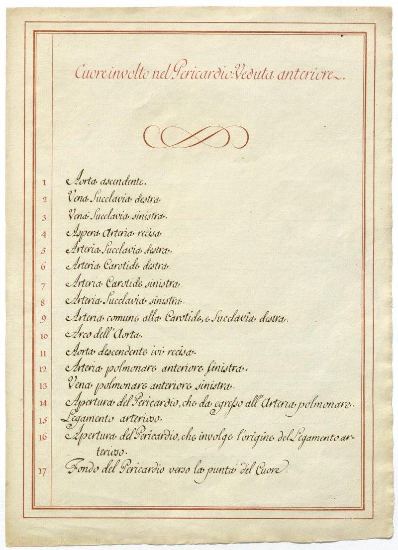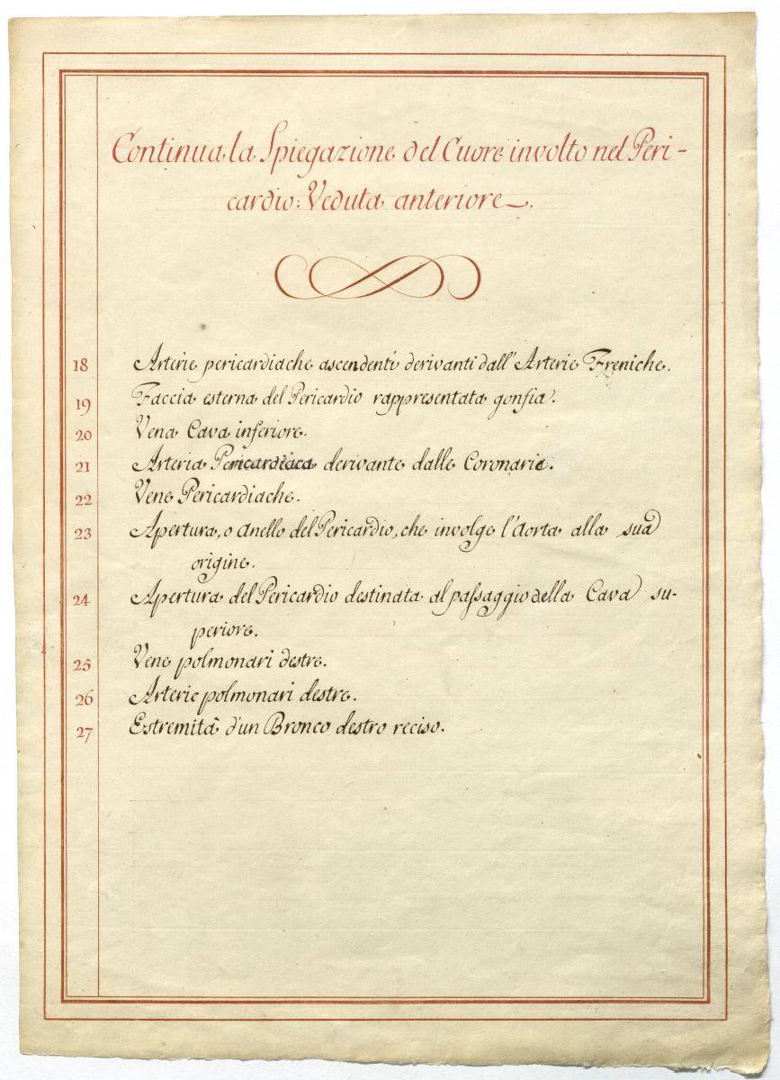 Der Text ist die ergänzende Beschreibung in italienischer Sprache zum anatomischen Wachsmodell des Herzbeutels.