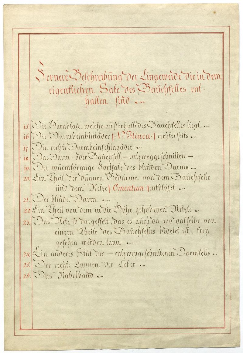Der Text ist die ergänzende Beschreibung in deutscher Sprache zum anatomischen Wachsmodell der Peritonealhöhle. Nur Blatt zwei des Textes ist erhalten.