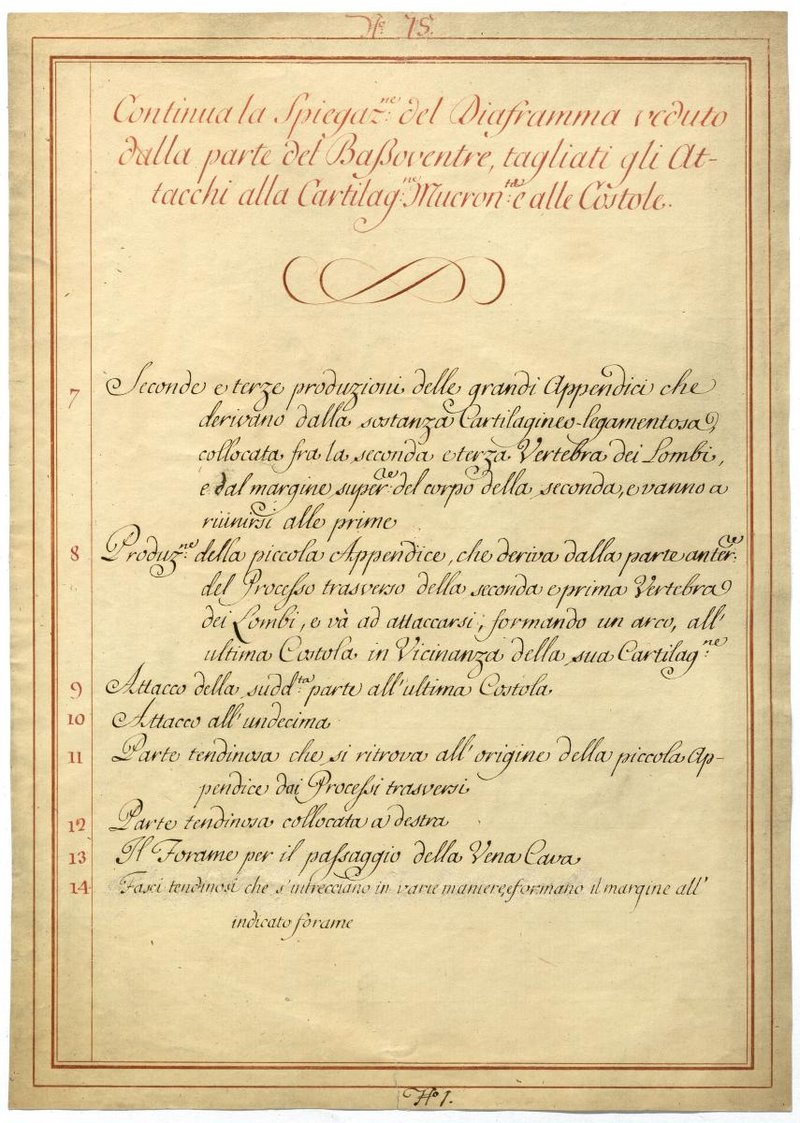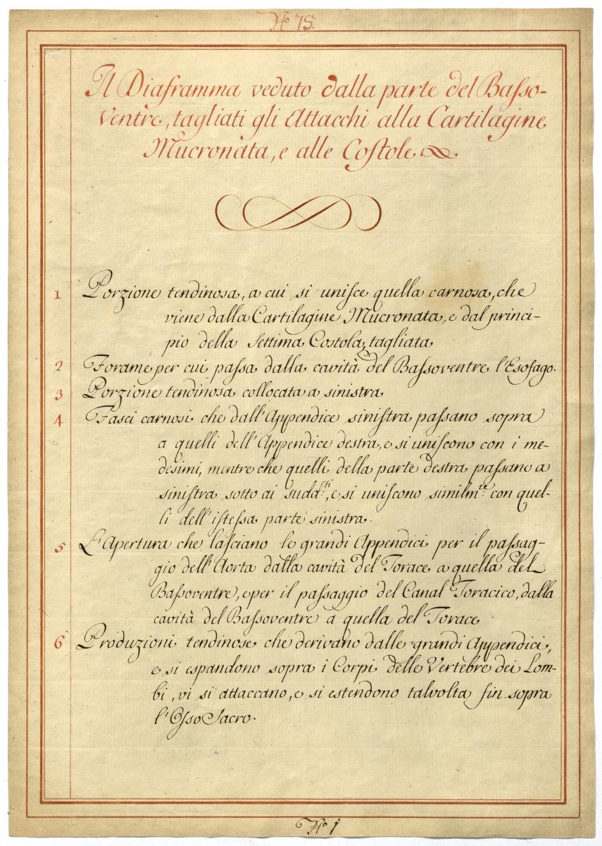 Der Text ist die ergänzende Beschreibung in italienischer Sprache zum anatomischen Wachsmodell des Zwerchfells.