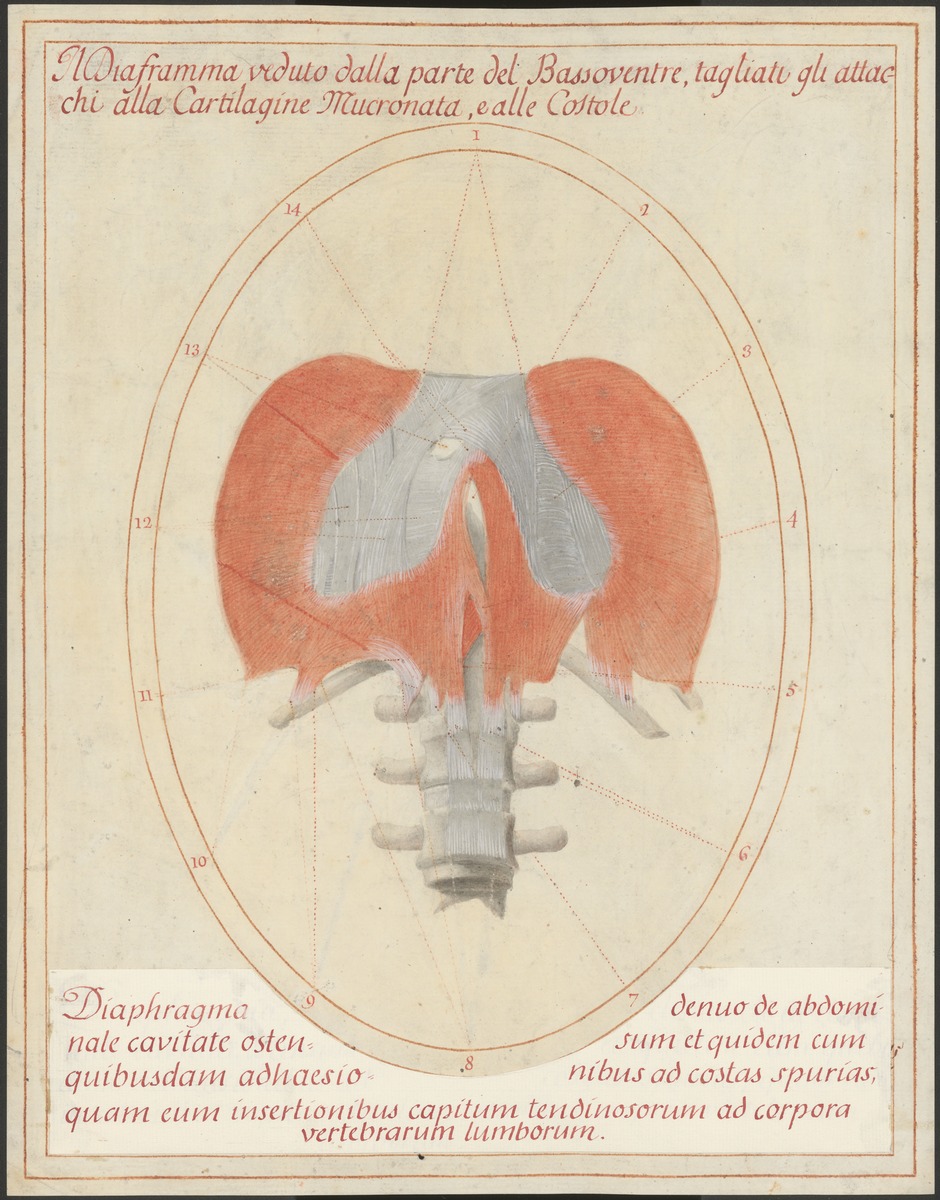 Das Zwerchfell (Diaphragma) und seine Ursprünge an der Wirbelsäule. Der vordere Teil der Rippenursprünge und der Brustbeinursprung sind nicht dargestellt.