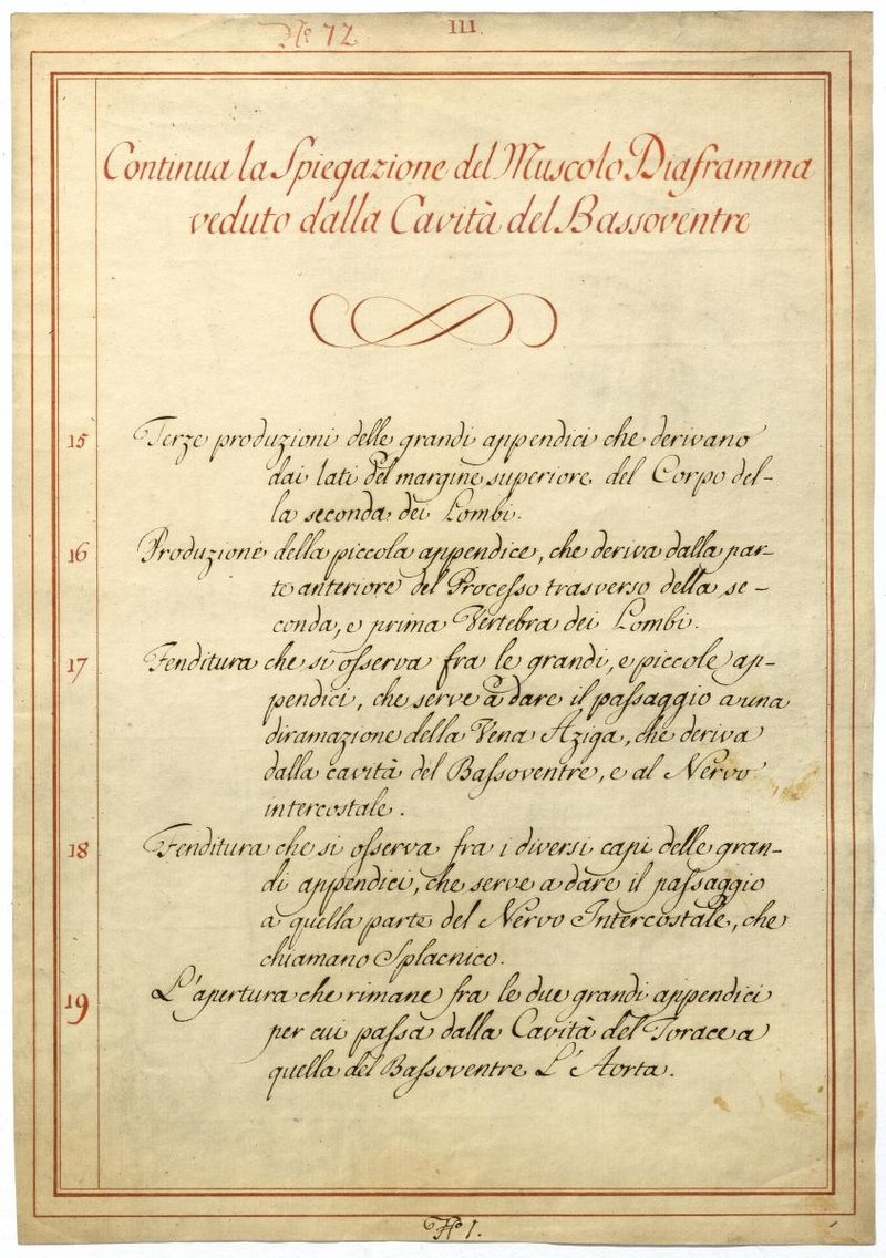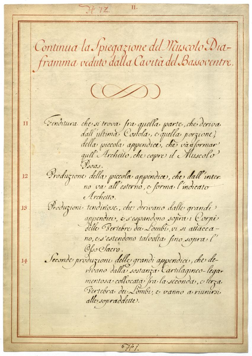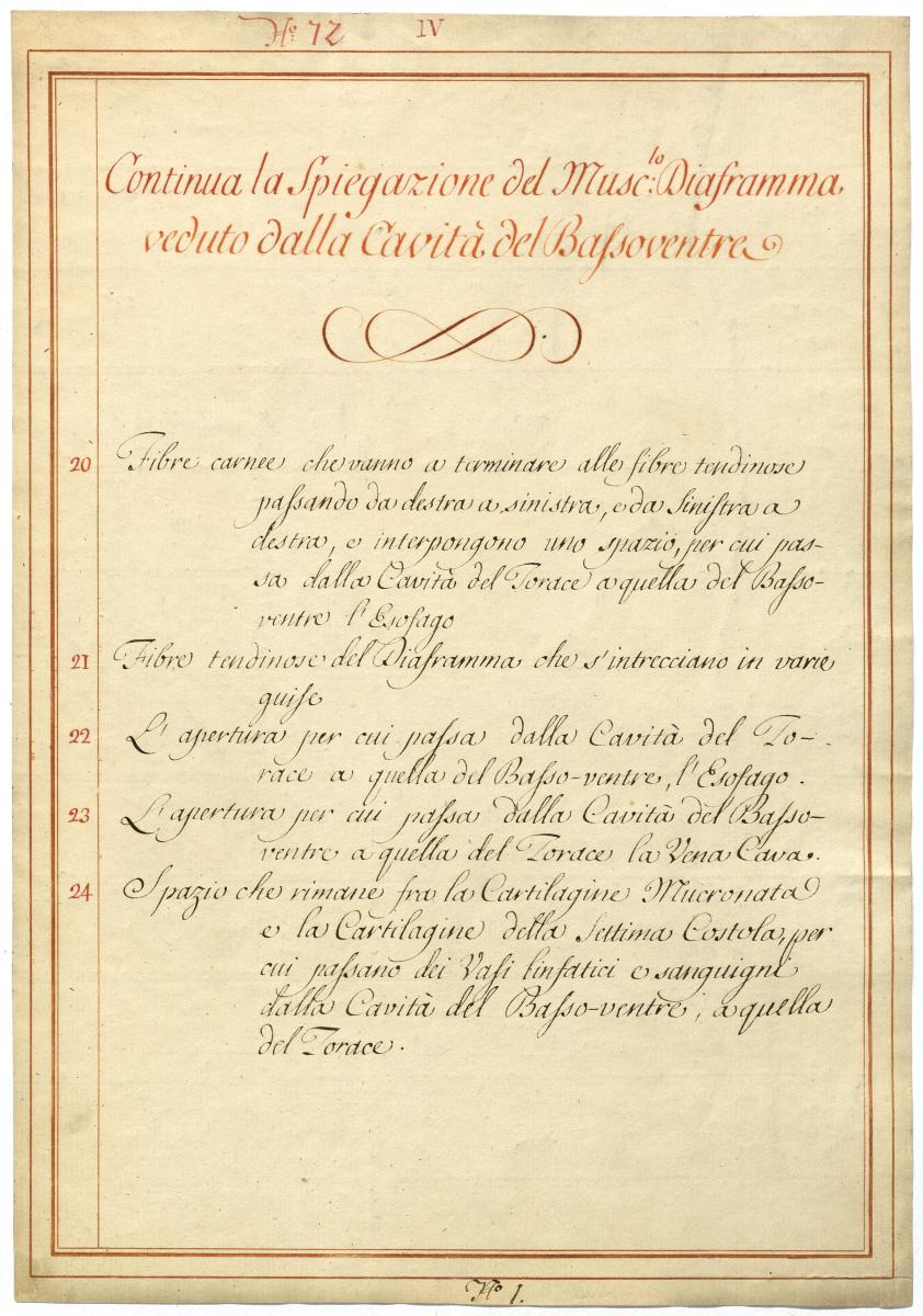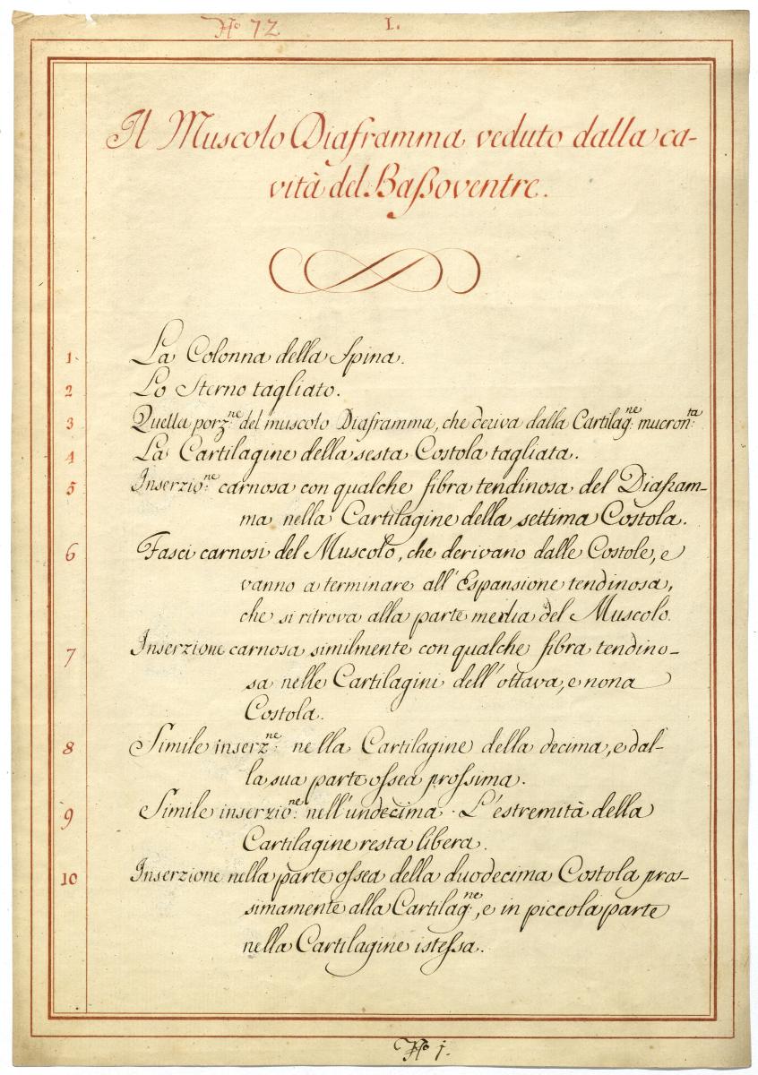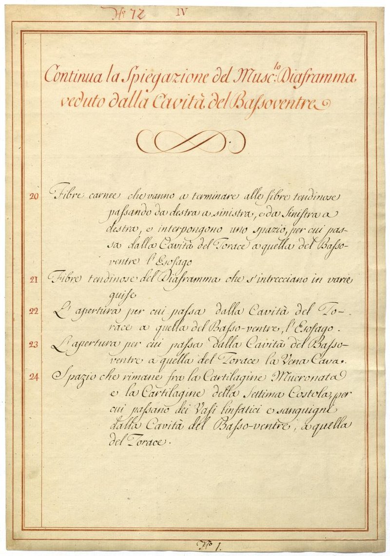 Der Text ist die ergänzende Beschreibung in italienischer Sprache zum anatomischen Wachsmodell des Zwerchfells.