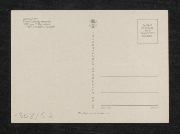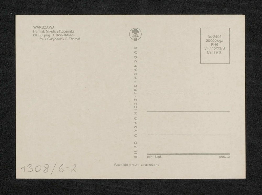 Das Denkmal wurde von Bildhauer Bertel Thorvaldsen errichtet. Die Aufnahme wurde von J. Chojnacki und A. Zborski angefertigt und die Postkarte wurde von Biuro Wydawniczo-Propagandowe vertrieben.