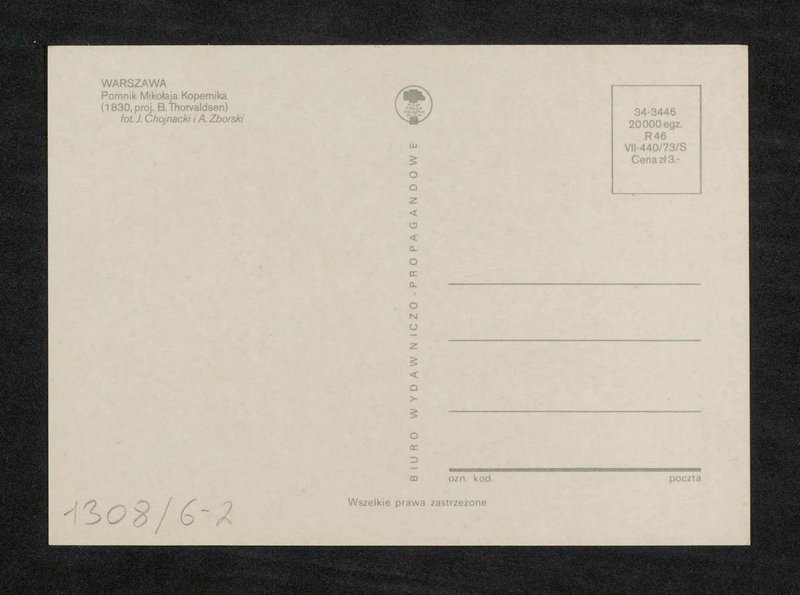 Das Denkmal wurde von Bildhauer Bertel Thorvaldsen errichtet. Die Aufnahme wurde von J. Chojnacki und A. Zborski angefertigt und die Postkarte wurde von Biuro Wydawniczo-Propagandowe vertrieben.