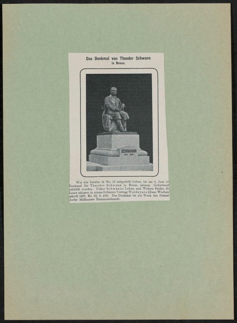 Die Abbildung stammt aus einem Zeitungsartikel anlässlich der Enthüllung des Denkmals für Theodor Schwann. Das Denkmal wurde von Joseph Hammerschmidt geschaffen.