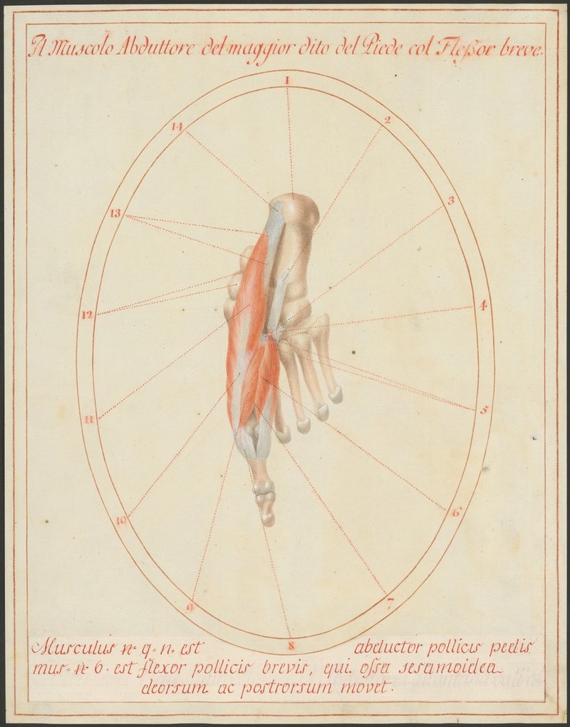 Fußskelett des rechten Fußes von plantar (Zehenknochen der 2.-5. Zehe fehlen): Musculus abductor hallucis und Musculus flexor hallucis brevis (kurzer Großzehenbeuger).