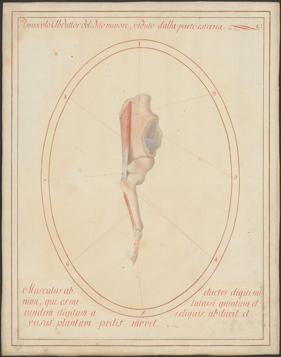Isolierte Darstellung von Fersenbein (Calcaneus), Würfelbein (Os cuboideum) und dem Kleinzehenstrahl eines linken Fußes von der Seite. Musculus abductor digiti minimi und Musculus opponens digiti minimi.