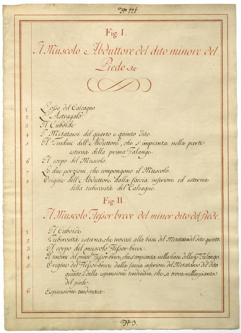 Der Text ist die ergänzende Beschreibung in italienischer Sprache zum anatomischen Wachsmodell der Detaildarstellungen von den Muskeln des Groß- und Kleinzehenballens.