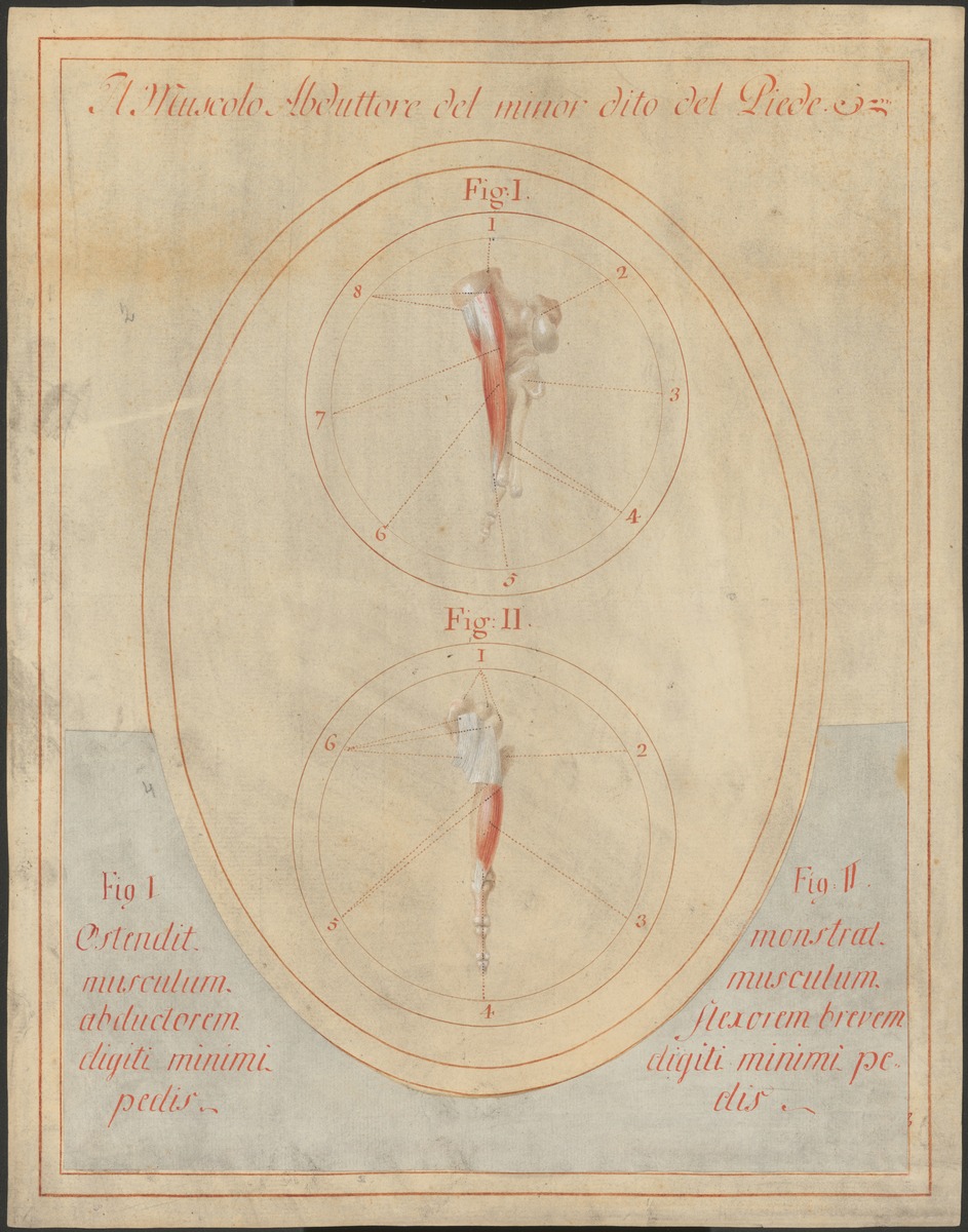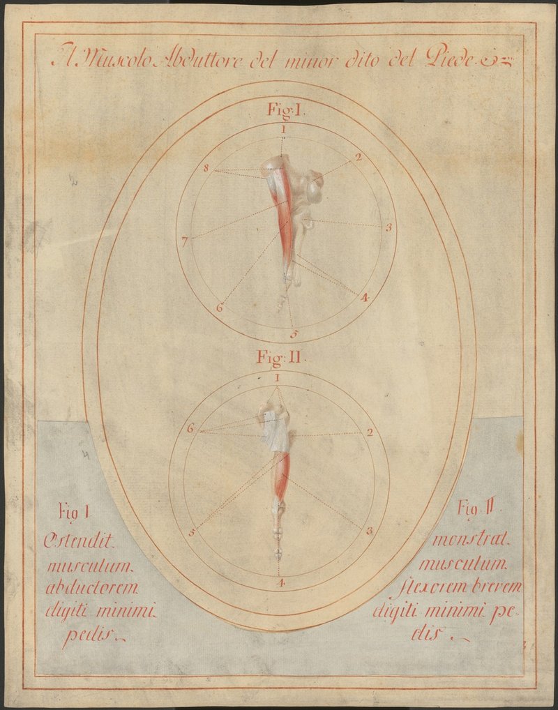 Fig. 1: 122/2: Der abziehende Muskel der kleinen Zehe (M. abductor digiti minimi), von unten. Fig. 122/4: Isolierte Darstellung von Würfelbein (Os cuboideum) und dem Kleinzehenstrahl eines linken Fußes von plantar. Musculus flexor digiti minimi brevis (kurzer Kleinzehenbeuger).