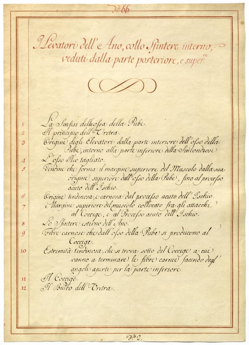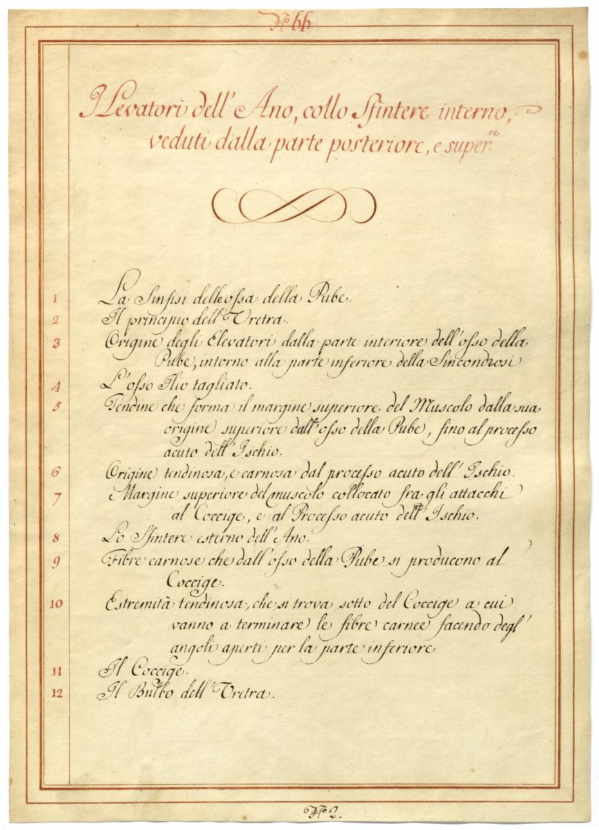 Der Text ist die ergänzende Beschreibung in italiensicher Sprache zum anatomischen Wachsmodell der Detailansichten der spezifischen Beckenbodenmuskulatur des Mannes.