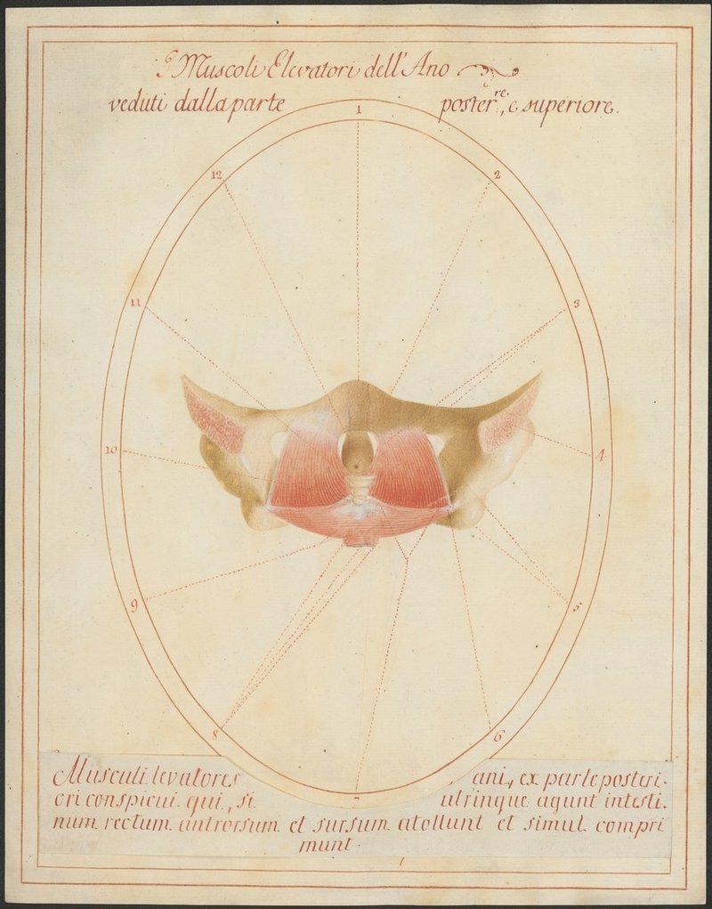 Der äußere Schließmuskel des Afters (Musculus sphincter ani externus), der Musculus levator ani und der Musculus coccygeus in der Ansicht von innen nach vorne.