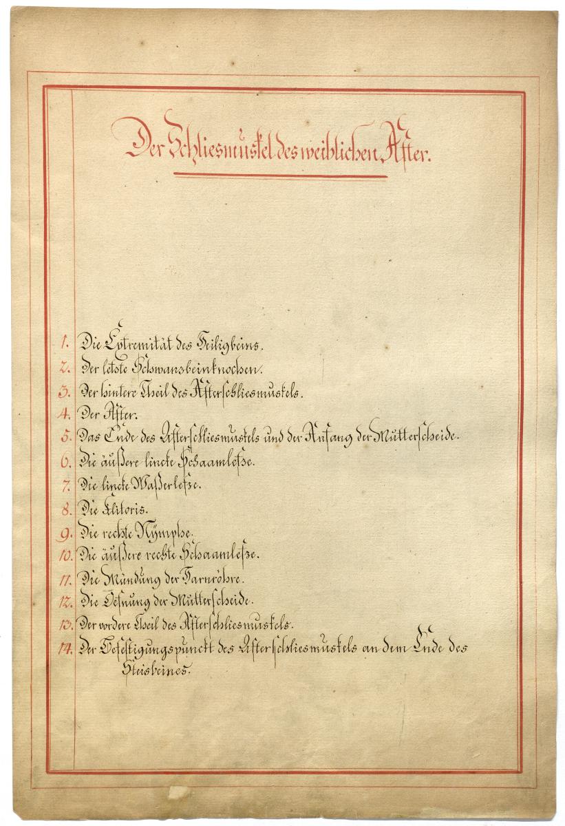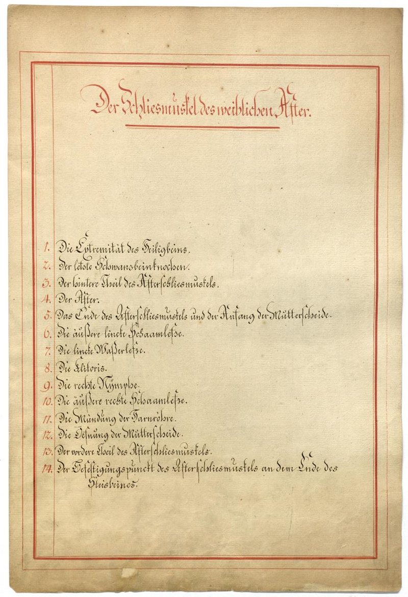 Der Text ist die ergänzende Beschreibung in deutscher Sprache zum anatomischen Wachsmodell der äußeren weiblichen Geschlechtsteile (Vulva).