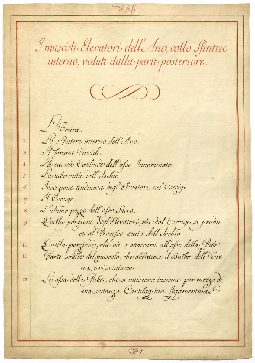 Der Text ist die ergänzende Beschreibung in italienischer Sprache zum anatomischen Wachsmodell der Detailansichten der spezifischen Beckenbodenmuskulatur des Mannes.