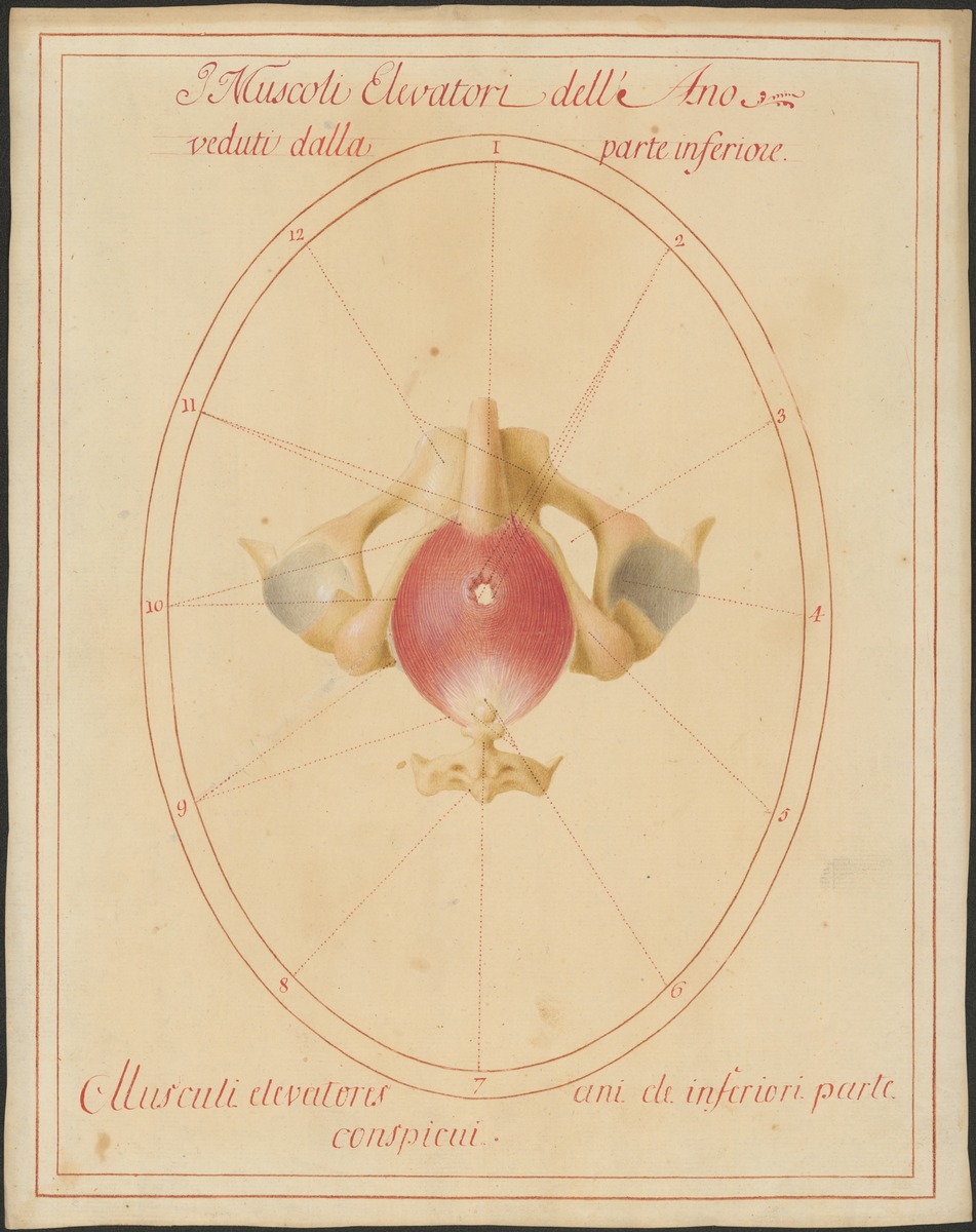 Der äußere Schließmuskel des Afters (Musculus sphincter ani externus) und der Musculus levator ani in der Ansicht von außen.