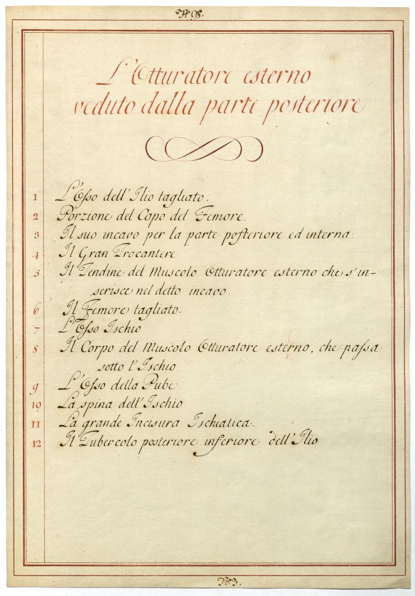 Der Text ist die ergänzende Beschreibung in italienischer Sprache zum anatomischen Wachsmodell der Hüft- und Oberschenkelmuskulatur.