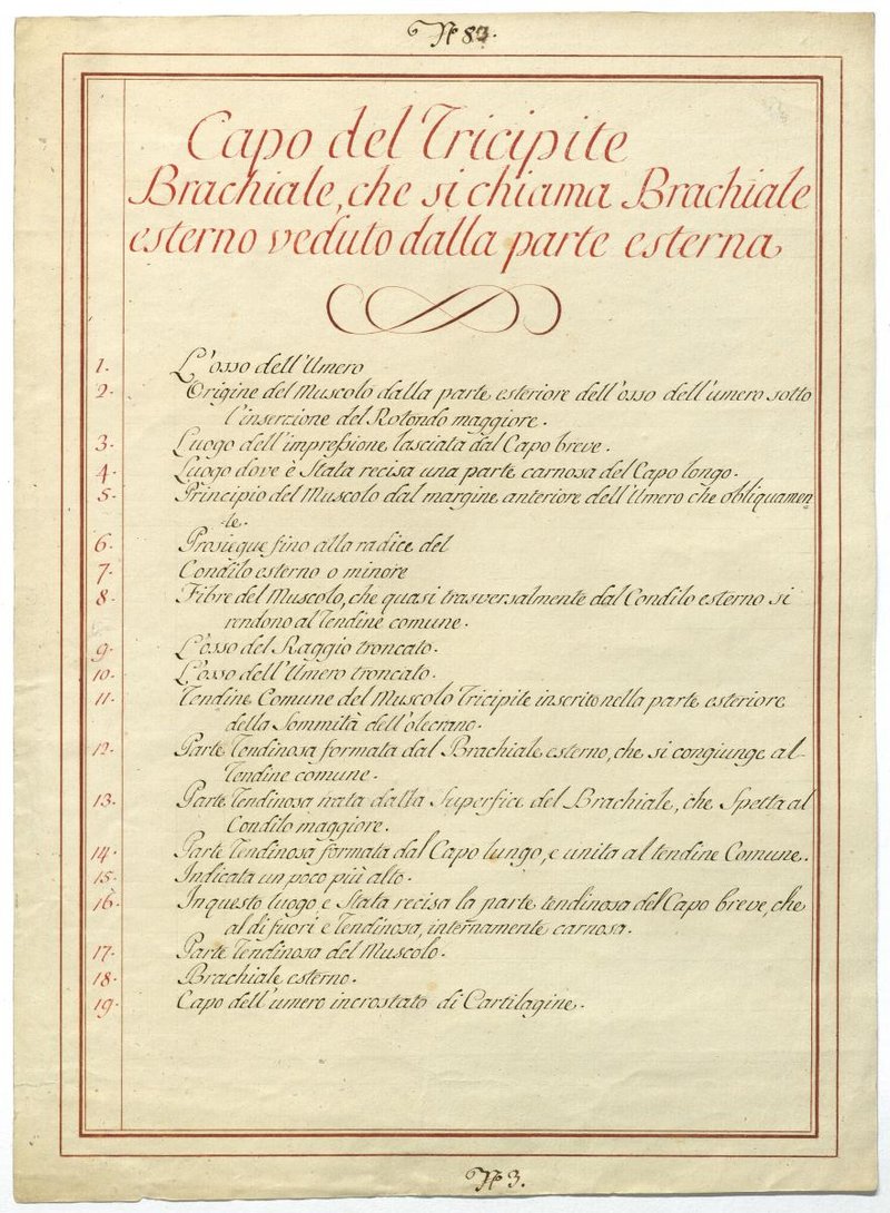 Der Text ist die ergänzende Beschreibung in italienischer Sprache zum anatomischen Wachsmodell des Ellenbogenstreckers.