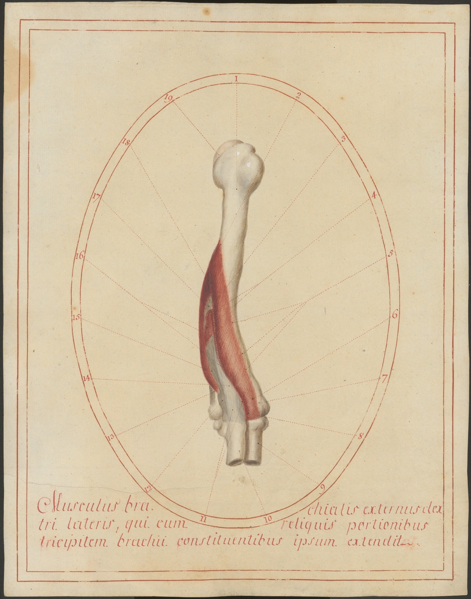 Oberarmknochen (Humerus) und proximale Unterarmknochen – Elle (Ulna) und Speiche (Radius) – der rechten Seite von hinten. Medialer Kopf des Musculus triceps brachii.