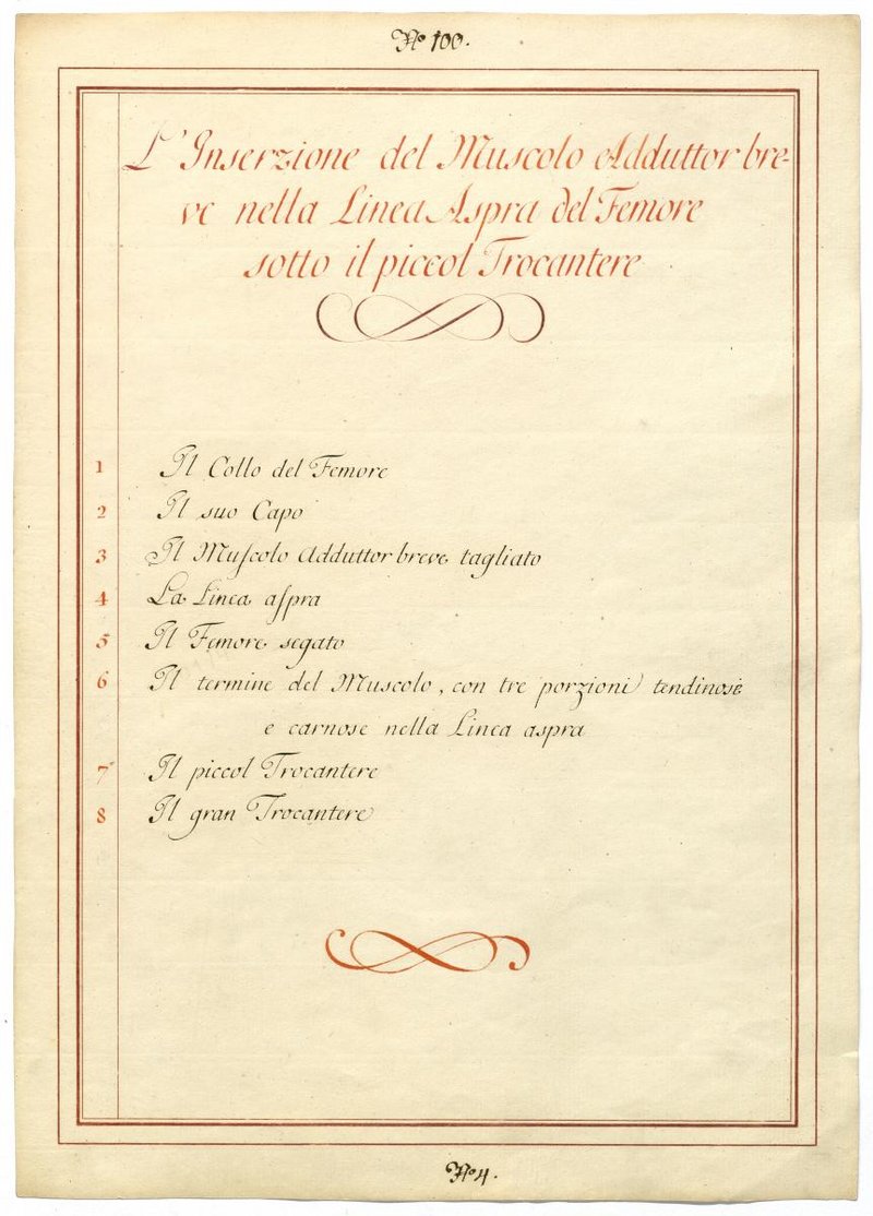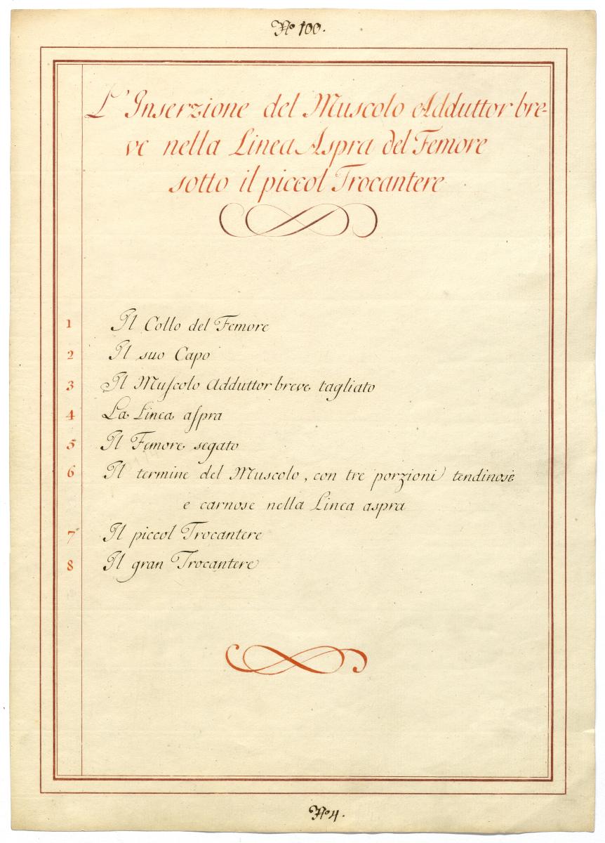 Der Text ist die ergänzende Beschreibung in italienischer Sprache zum anatomischen Wachsmodell der Adduktorenmuskulatur.