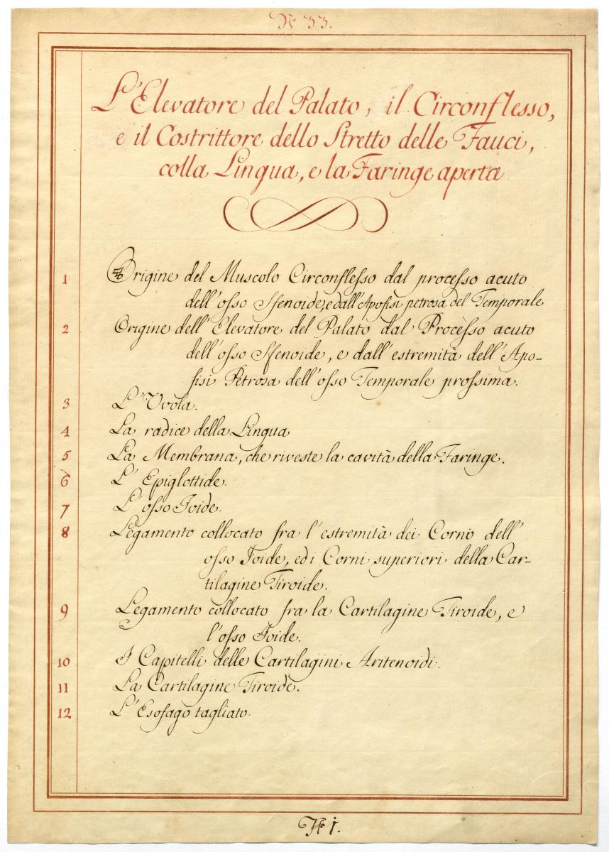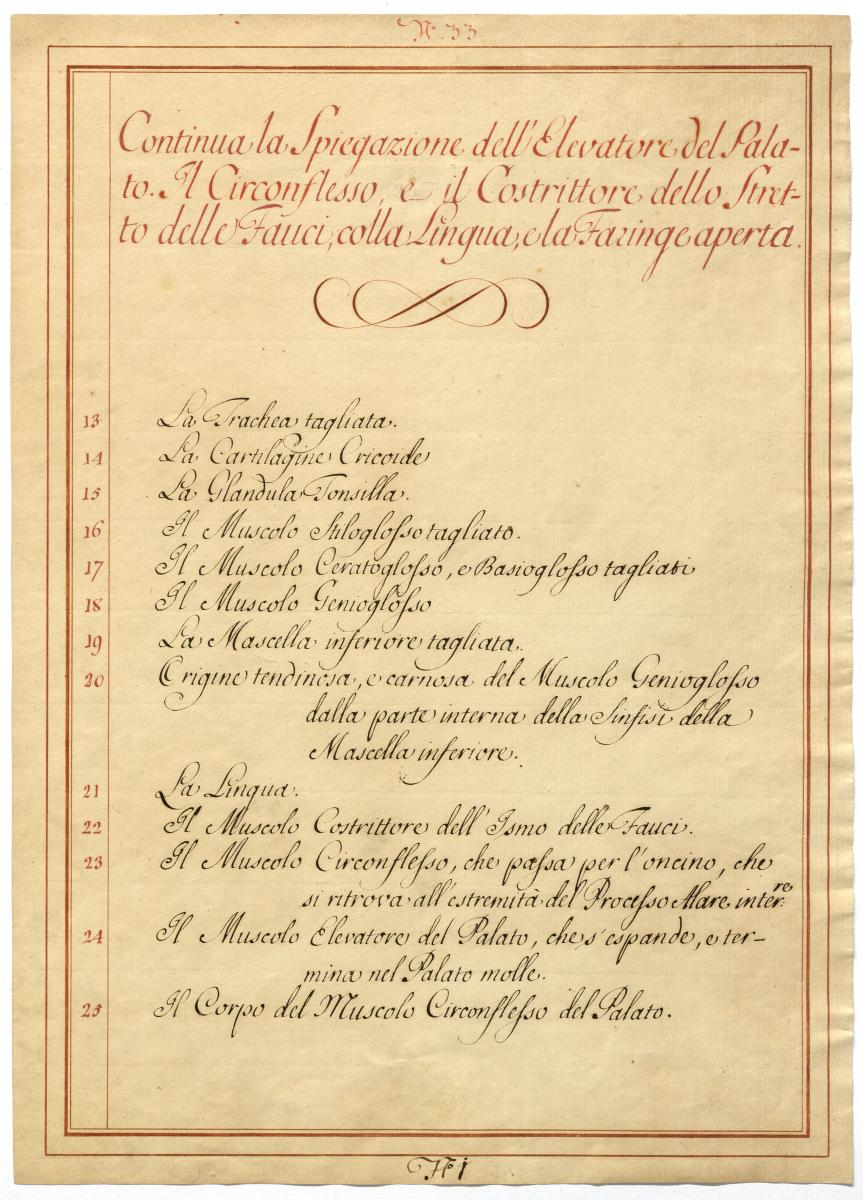 Der Text ist die ergänzende Beschreibung in italienischer Sprache zum anatomischen Wachsmodell der äußeren Zungenmuskulatur.