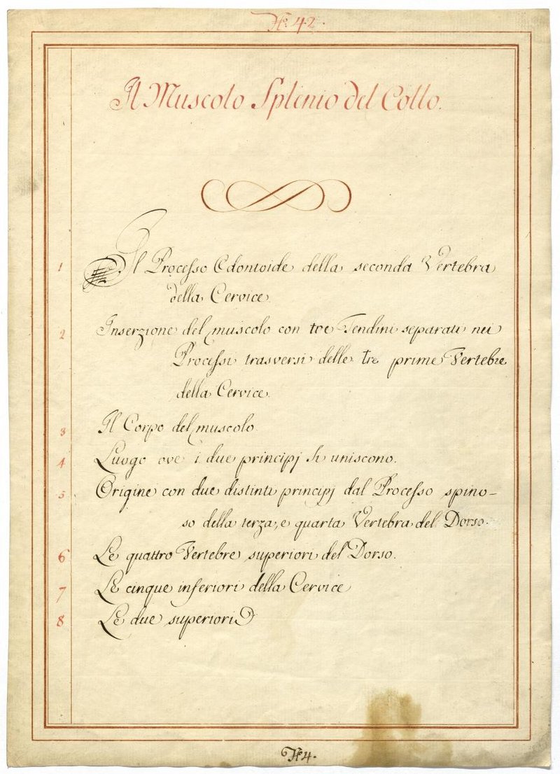 Der Text ist die ergänzende Beschreibung in italienischer Sprache zum anatomischen Wachsmodell der autochthonen Muskeln des Nackens.