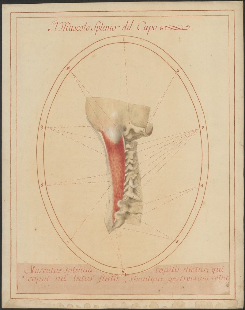 Isoliertes Model der hinteren rechten Schädelhälfte (ohne Gesichtsteil) und der Halswirbelsäule von der Seite. Rechter Musculus splenius capitis.