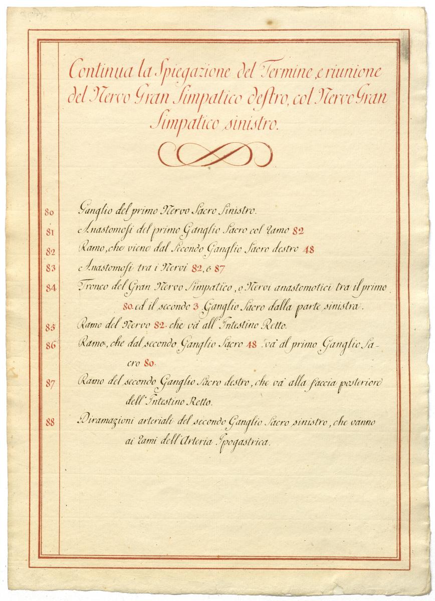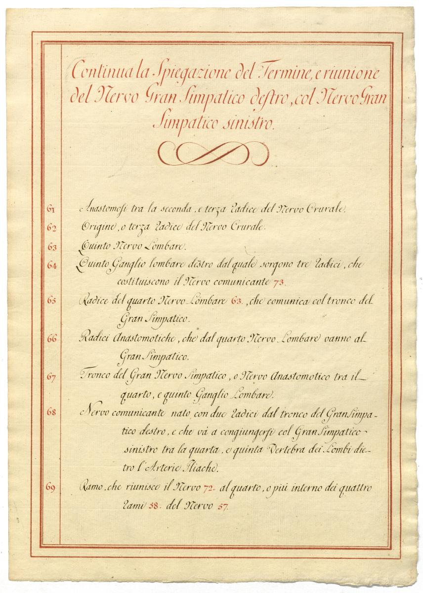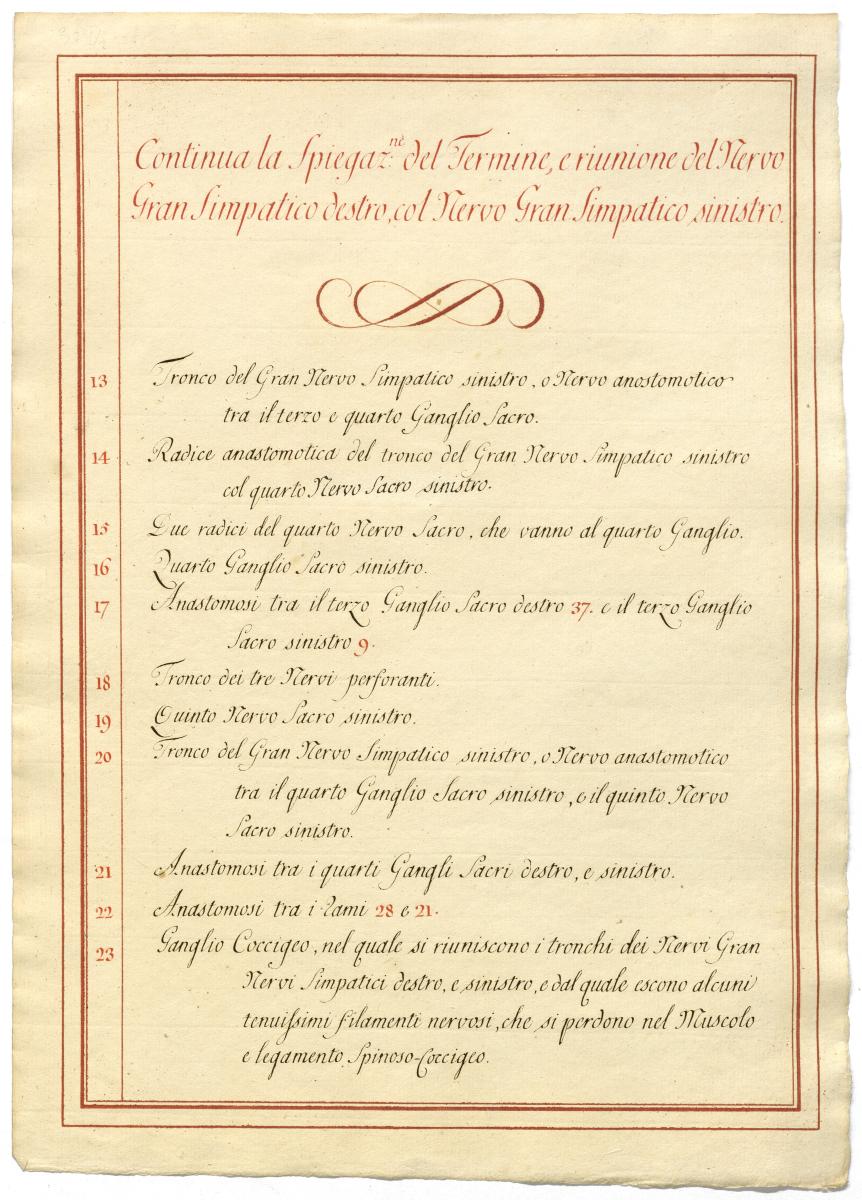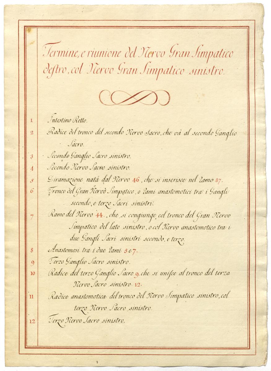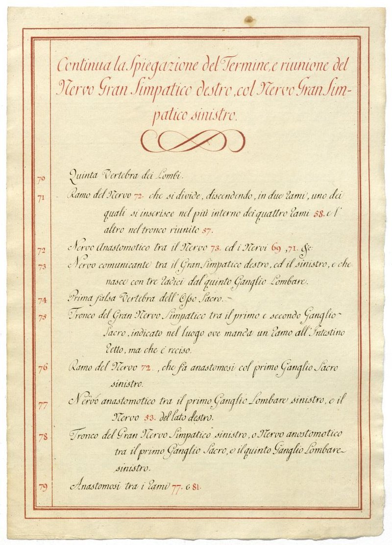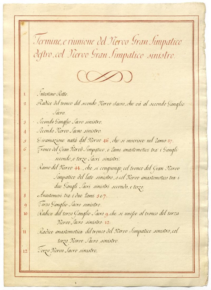 Der Text ist die ergänzende Beschreibung in italienischer Sprache zum anatomischen Wachsmodell des Grenzstranges des sympathischen Nervensystems.
