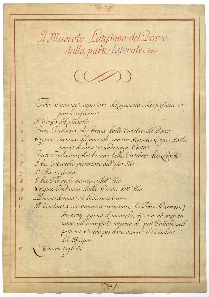 Der Text ist die ergänzende Beschreibung in italienischer Sprache zum anatomischen Wachsmodell der Rückenmuskulatur.
