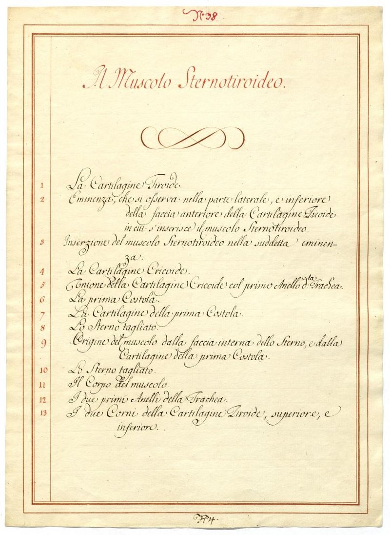 Der Text ist die ergänzende Beschreibung in italienischer Sprache zum anatomischen Wachsmodell der Kehlkopf- und Rachenmuskulatur.