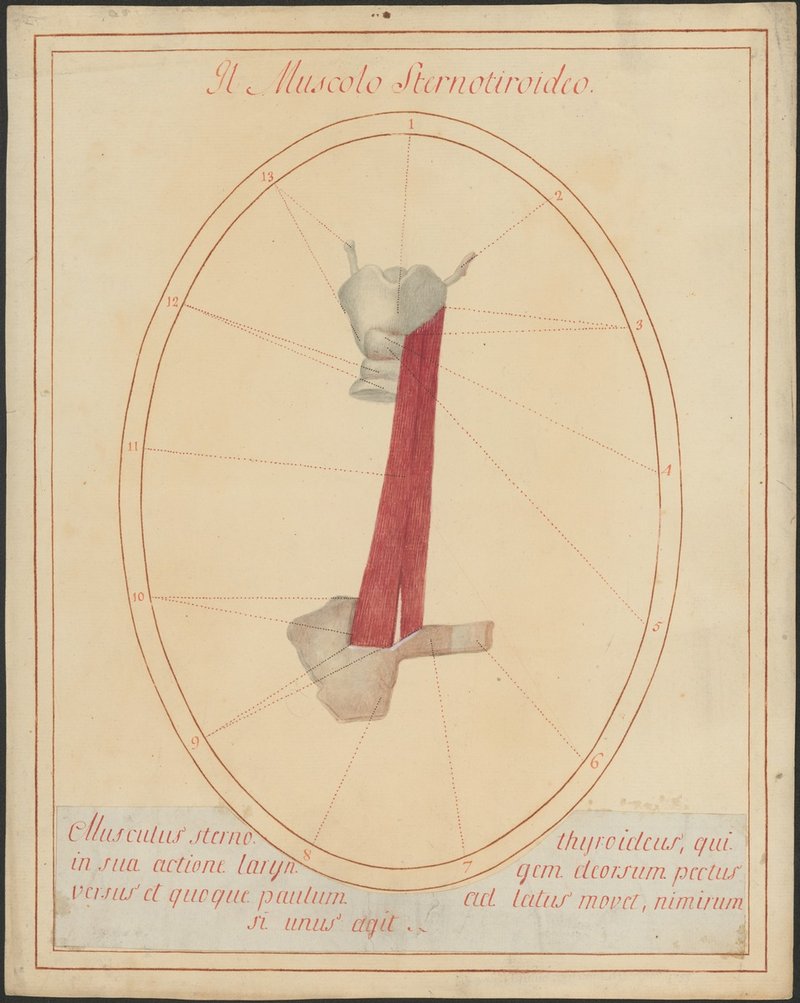 Isoliertes Modell des Kehlkopfes mit beginnender Luftröhre sowie des oberen Teiles des Brustbeines (Manubrium sterni) mit einem Teil der linken ersten Rippe. Der linke Musculus sternothyreoideus ist dargestellt, wobei hierbei zu betonen ist, dass der Abstand zwischen Kehlkopf und Brustbein überdimensioniert ist und auch der Muskel selbst an der Rückseite – und nicht an der Vorderseite – von Brustbein und erster Rippe entspringt.