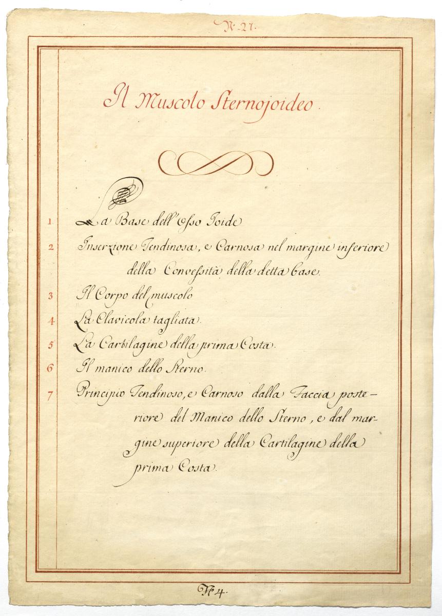 Der Text ist die ergänzende Beschreibung in italienischer Sprache zum anatomischen Wachsmodell der Ober- und Unterzungenbeinmuskulatur.
