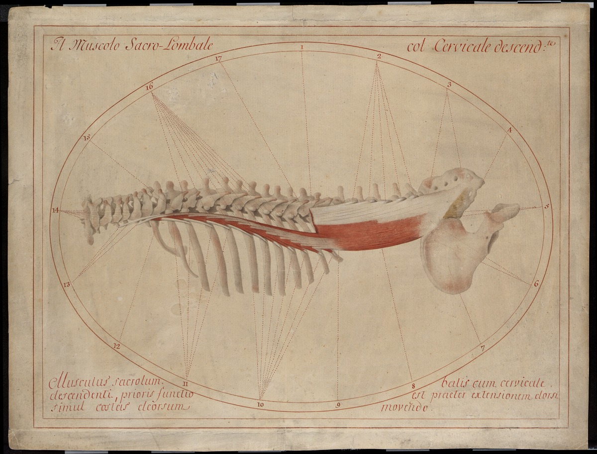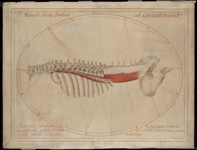 Wirbelsäule bis zum Kreuzbein (Os sacrum) inklusive linkem Beckenknochen (Os coxae) und linkem Brustkorb, von hinten. Der Musculus iliocostalis mit seinen drei Anteilen (Musculus iliocostalis cervicis, Musculus iliocostalis thoracis und Musculus iliocostalis lumborum) sowie der durchtrennte und teilweise abgetragene Musculus longissimus.