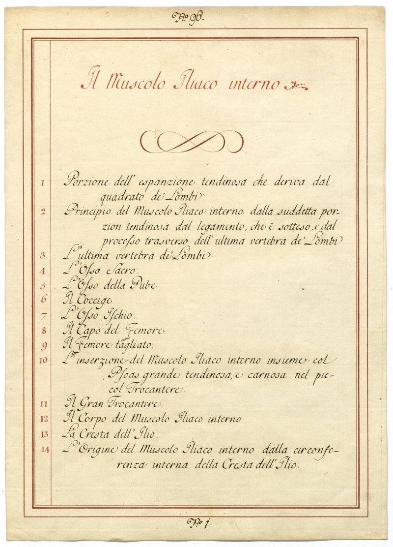 Der Text ist die ergänzende Beschreibung in italienischer Sprache zum anatomischen Wachsmodell der Hüftmuskulatur.