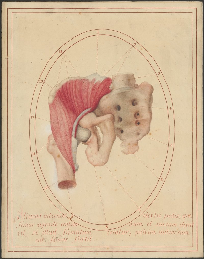 Kreuzbein (Os sacrum) und 5. Lendenwirbel mit rechtem Beckenknochen (Os coxae) und rechtem proximalen Oberschenkelknochen (Femur) von vorne. Der Musculus iliacus und der gemeinsame Ansatz dieses Muskels mit dem Musculus psoas major am Trochanter minor.
